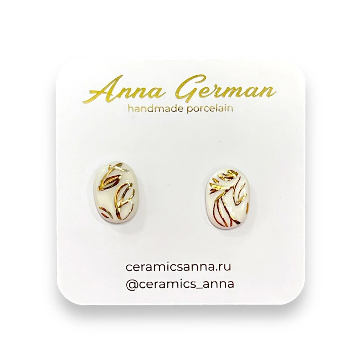 Серёжки-гвоздики Анна Герман «Овал с золотыми листьями», фарфор