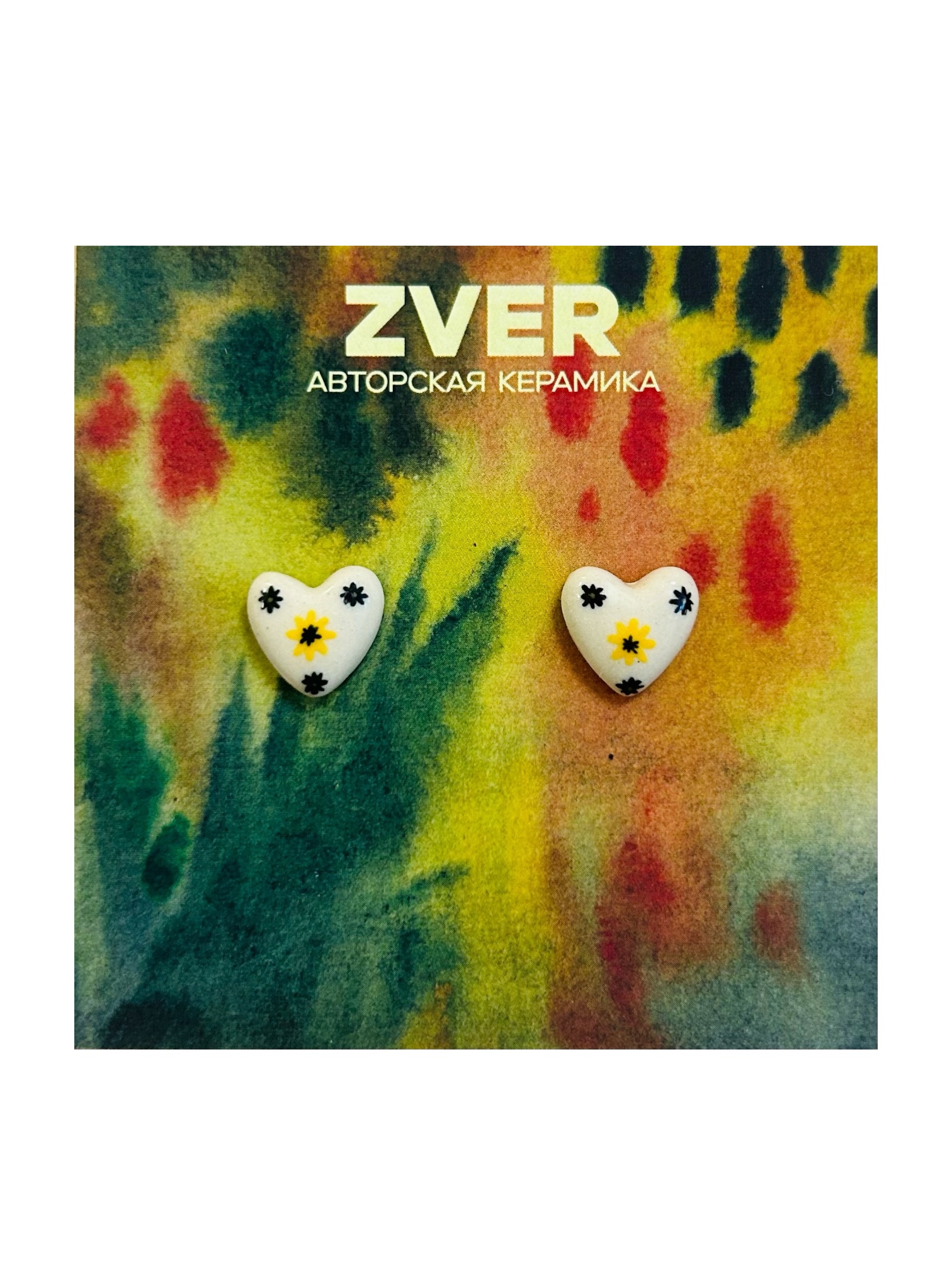 Серёжки-гвоздики ручной работы «Белые сердечки с подсолнухом», керамика
