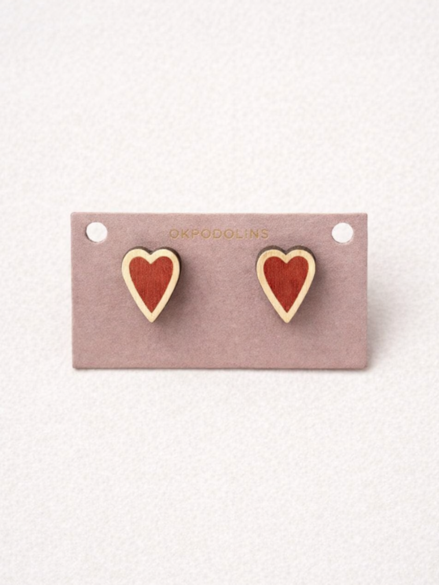 Серёжки-гвоздики Сердечки, дерево, красно-золотистые