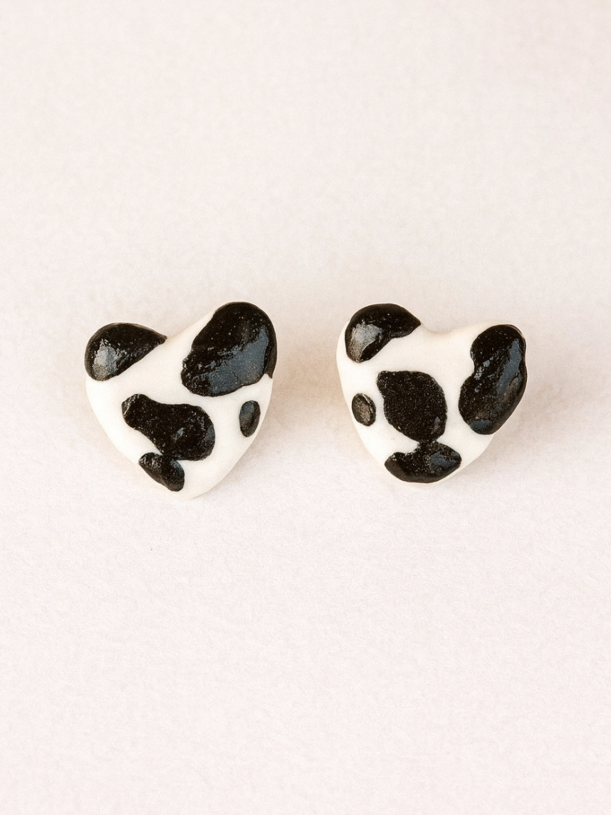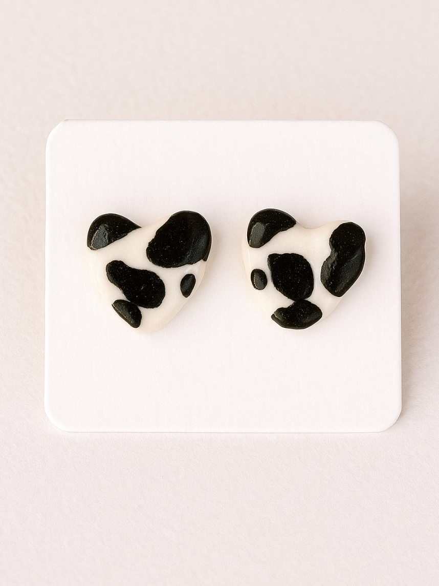 Милые серёжки-гвоздики в виде сердечек с коровьим принтом. Отличный подарок для себя или подруги.