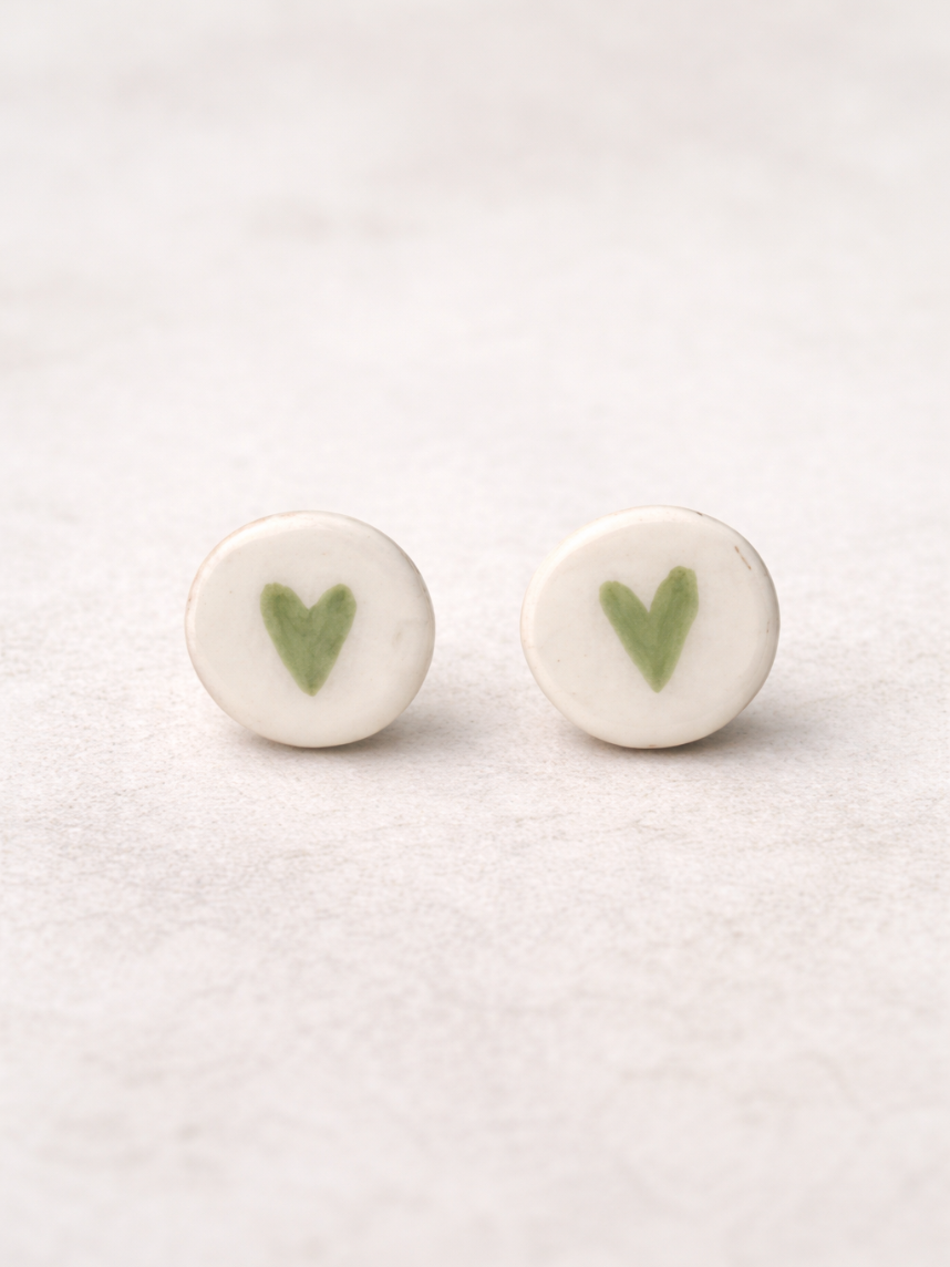 Серёжки-гвоздики Сердечко, круглые, керамика, бело-зелёные
