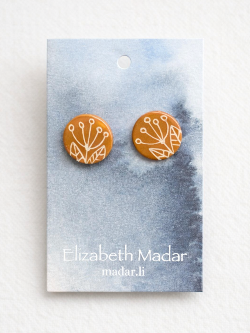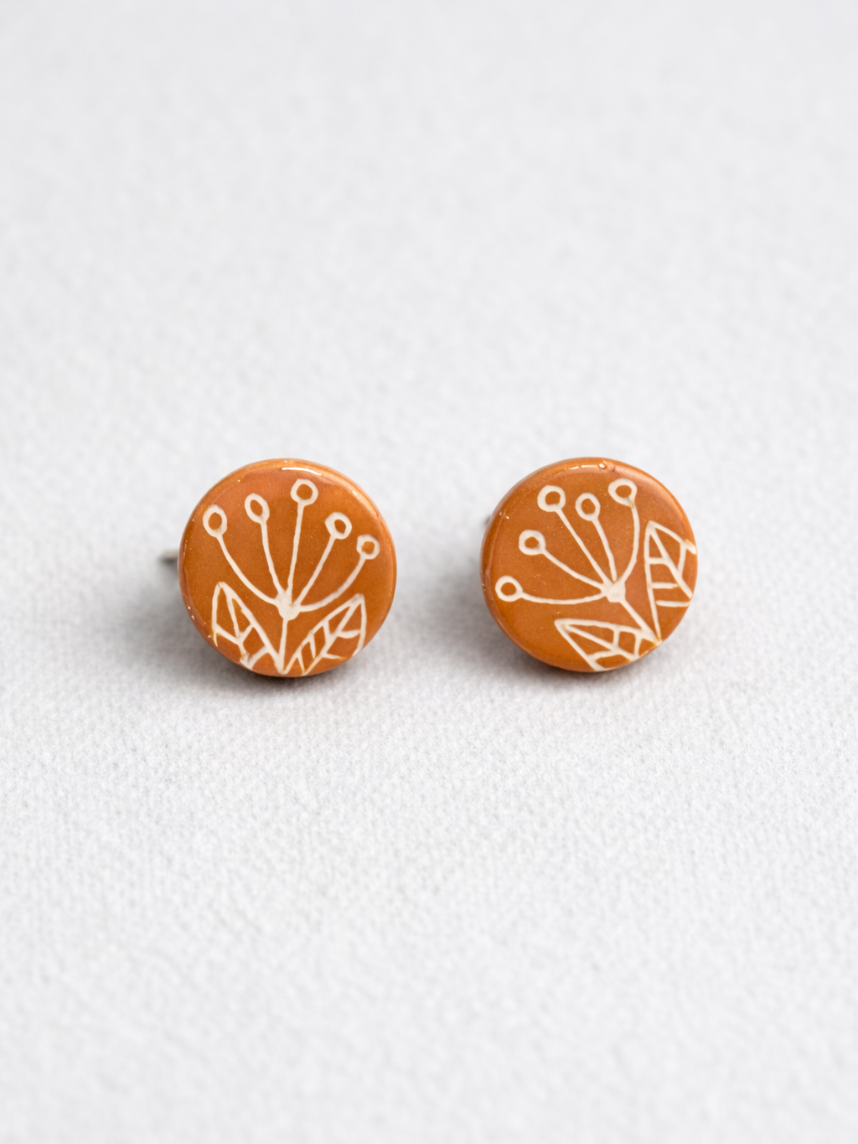 Серёжки-гвоздики с цветочным орнаментом, круглые, керамика, оранжевые