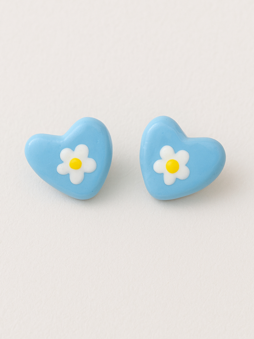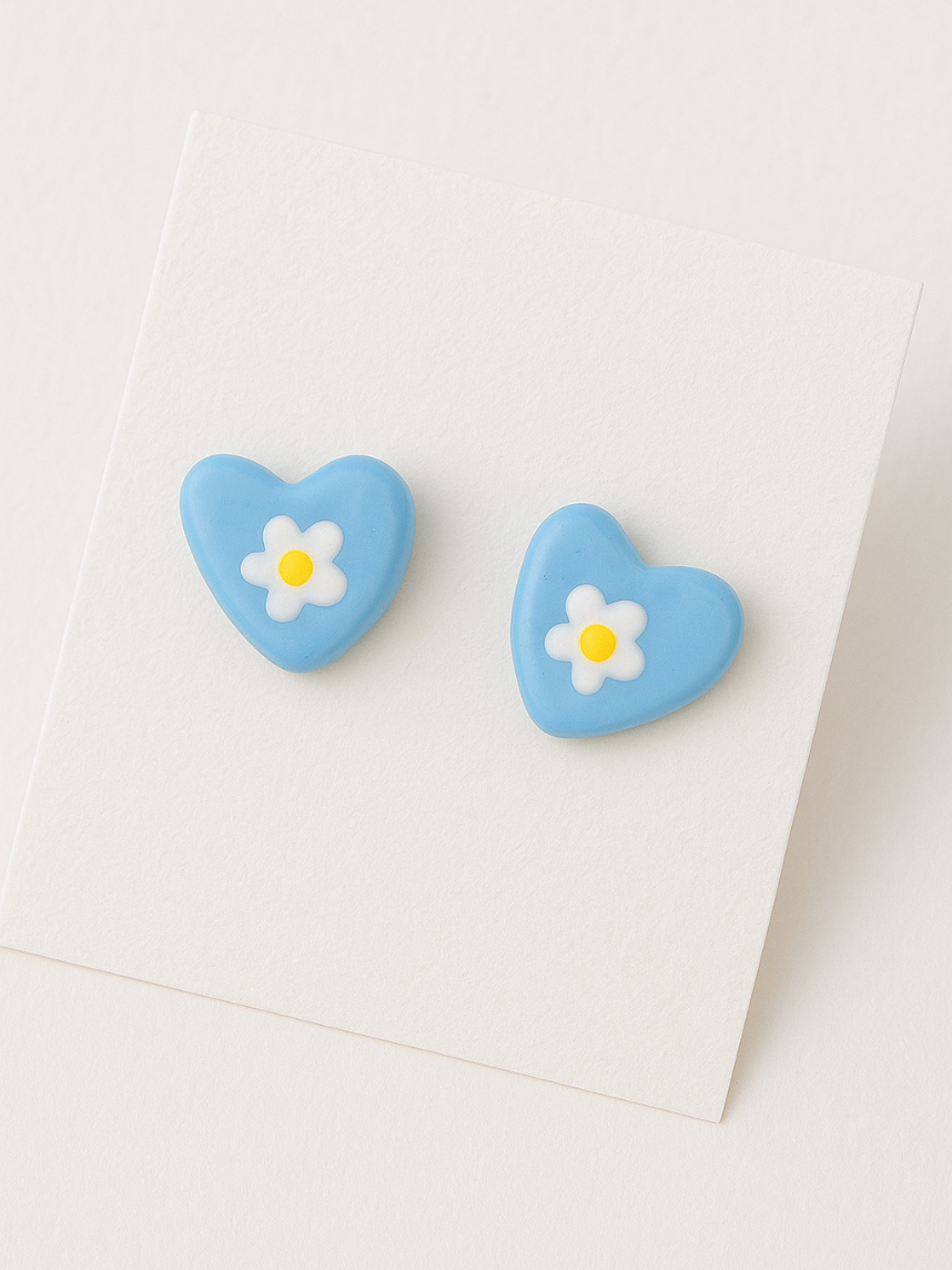 Серёжки-гвоздики «Сердечки с цветочком», полимерная глина, голубые