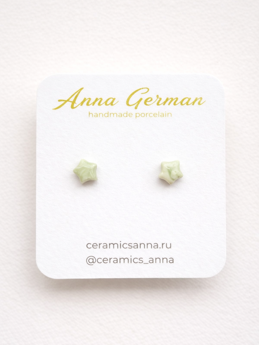 Элегантные фарфоровые серёжки-гвоздики «Звёздочки» зеленые мраморные.