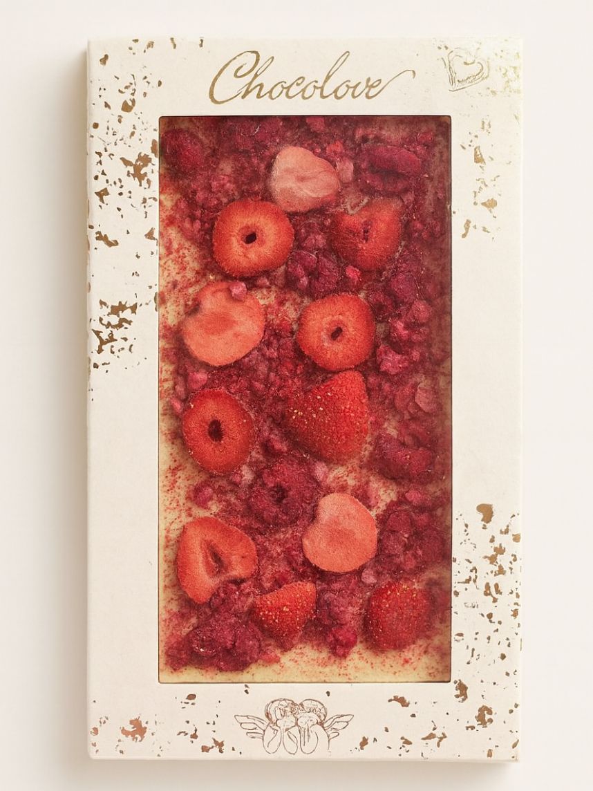 Белый шоколад с клубникой и малиной - это нежное сочетание бельгийского шоколада ручной работы с ягодами.