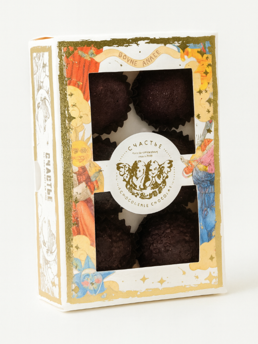 Набор из 6 трюфелей: трюфель темный шоколад с черникой и тимьяном 2 шт трюфель горький шокола с кунжутом и морской солью 2 шт трюфель молочный шоколад с черной смородиной и мятой в горьком шоколаде Конфеты упакованы в нарядную коробочку и станут отличным дополнением к подарку.
