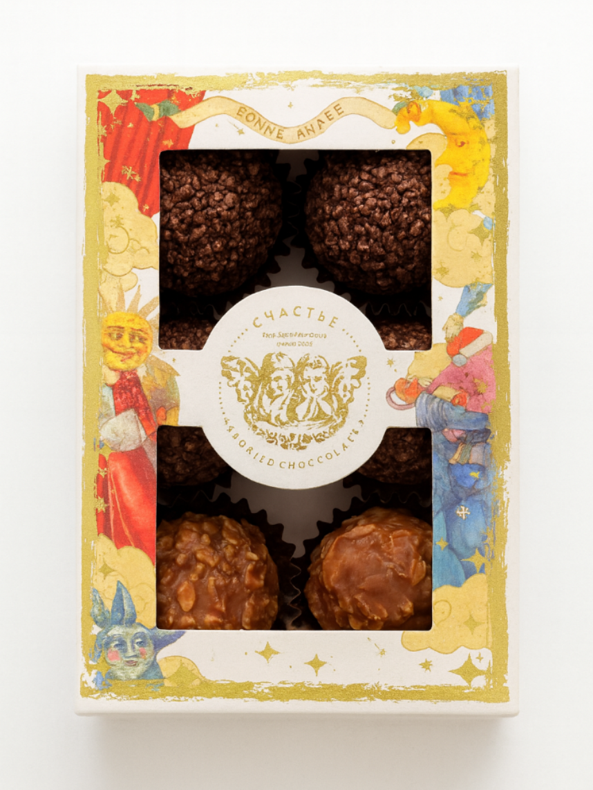 • Состав: горький шоколад 72% (какао тертое, сахар, масло какао, эмульгатор: соевый лецитин, натуральный экстракт ванили), сахар, тёмный шоколад 52% (сахар, какао тертое, масло какао, эмульгатор: соевый лецитин, натуральный экстракт ванили), арахис, вафельная крошка (мука пшеничная, сахар; молочный жир; лактоза (молоко); молочный белок; cоль; экстракт солода (ячмень); разрыхлитель: сода пищевая), фундук, кешью, масло какао, вишня, молочный шоколад 30% (сахар, сухое цельное молоко, масло какао, какао тертое, сухое обезжиренное молоко, эмульгатор: соевый лецитин, натуральный экстракт ванили), грецкий орех, крошка миндального печенья (мука пшеничная в/с, мука миндальная, сахар, масло сливочное, яйцо, соль морская), ягоды годжи (ягоды годжи, сахар), кунжут, миндаль, чернослив, яйцо, какао-бобы (крупка), сироп глюкозы, ром Бакарди тёмный (вода питьевая исправленная, ромовый выдержанный дистиллят, краситель: сахарный колер), ликёр крепкий Шартрез Верт (вода, спирт этиловый ректификованный, сахар, уникальный запатентованный состав из трав и цветов: анис зелёный, мелисса, корень ангелики и др. ), соль, агент желирующий: пектин; какао-порошок, куркума молотая, фисташка, красители натуральные: бета-каротин, экстракт чёрной моркови, медный комплекс хлорофиллинов; чай зелёный матча, сок свеклы красной (порошок), паприка красная молотая