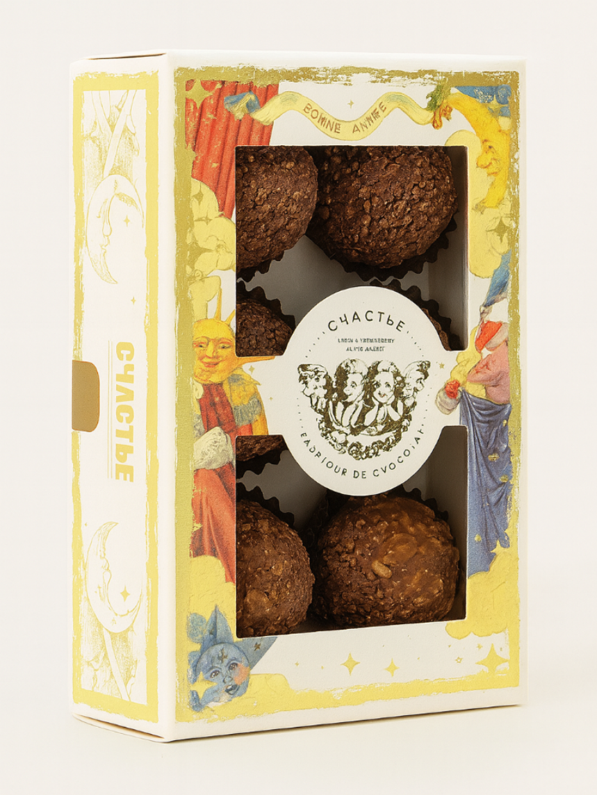 Набор из 6 трюфелей: трюфель молочный шоколад с фундуком и черным кардамоном 2 шт трюфель молочный шоколад с бананом, солодом и миндалем 2 шт трюфель молочный шоколад с кокосом, ванилью и ликером малибу 2 шт Конфеты упакованы в нарядную коробочку и станут отличным дополнением к подарку.