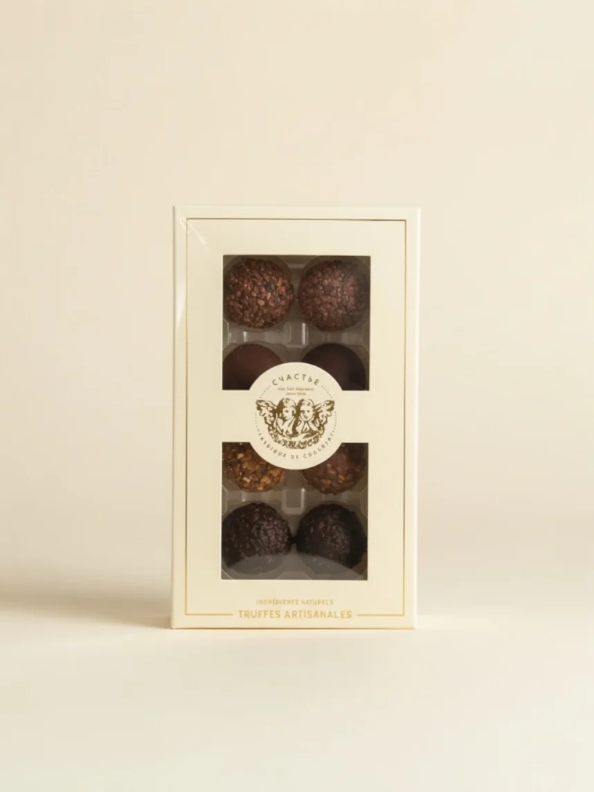 Набор из 8 трюфелей: трюфель молочный шоколад с арахисом и карамелью 2 шт трюфель молочный шоколад с черникой и тимьяном 2 шт трюфель молочный шоколад с бананом, солодом и миндалём 2 шт трюфель горький шоколад с кунжутом и морской солью 2 шт Конфеты упакованы в нарядную коробочку и станут отличным дополнением к подарку.