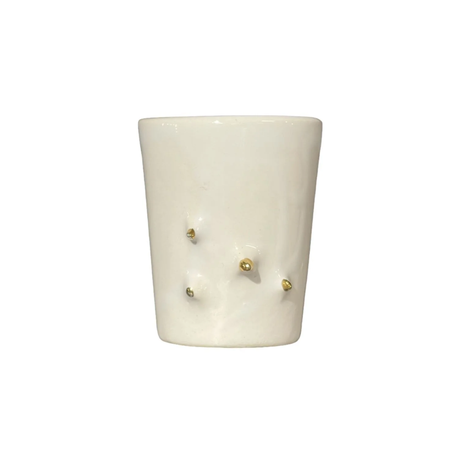Необычный шот с шипами от петербургского бренда Z& ceramics. Элегантное сочетание плавных форм, гладкой глазури с золотыми шипами - всё это придаёт шоту неповторимый шарм. Станет великолепным подарком себе или такому же ценителю авторской керамики.