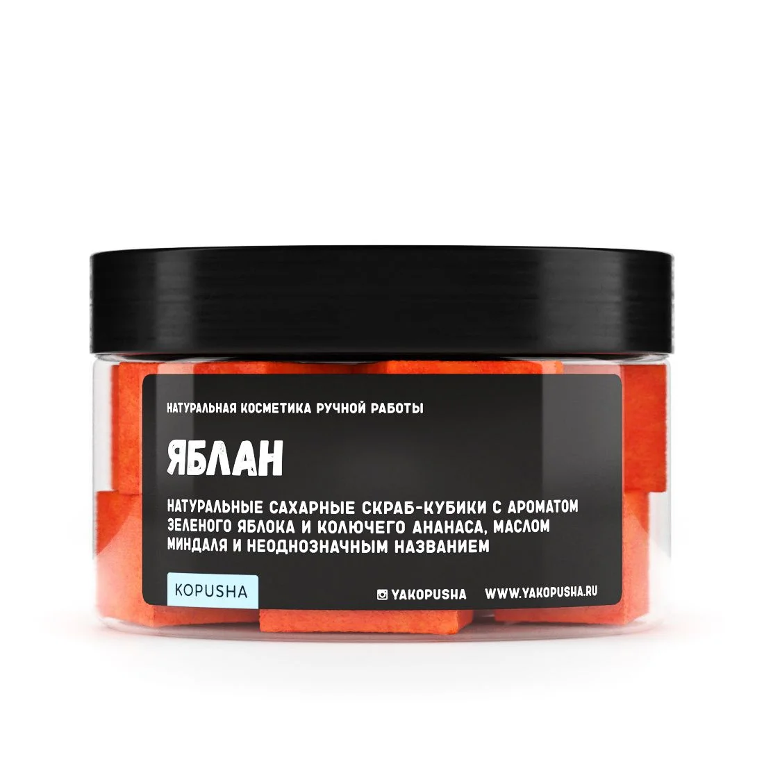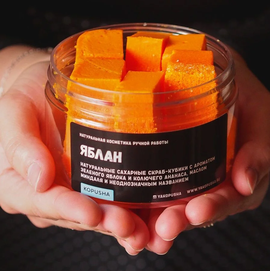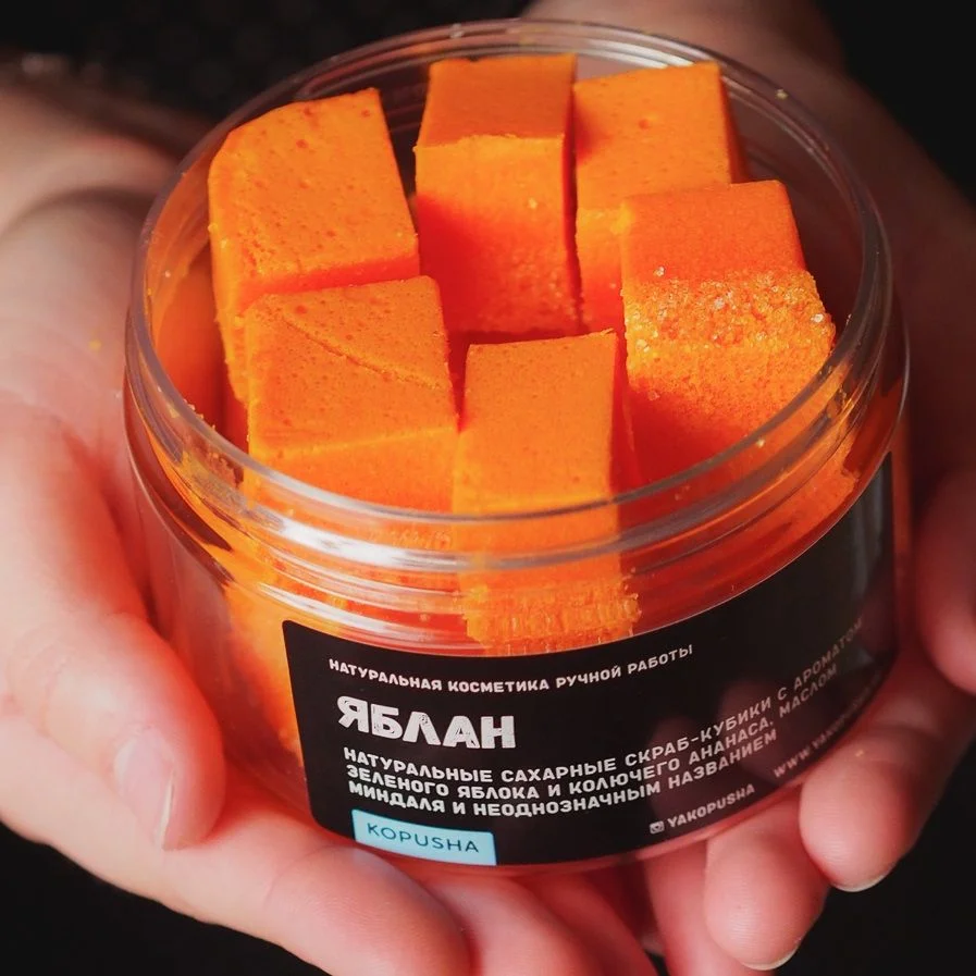 Оранжевые скраб-кубики KOPUSHA с ароматом зелёного яблока и колючего ананаса, маслом миндаля и неоднозначным названием.