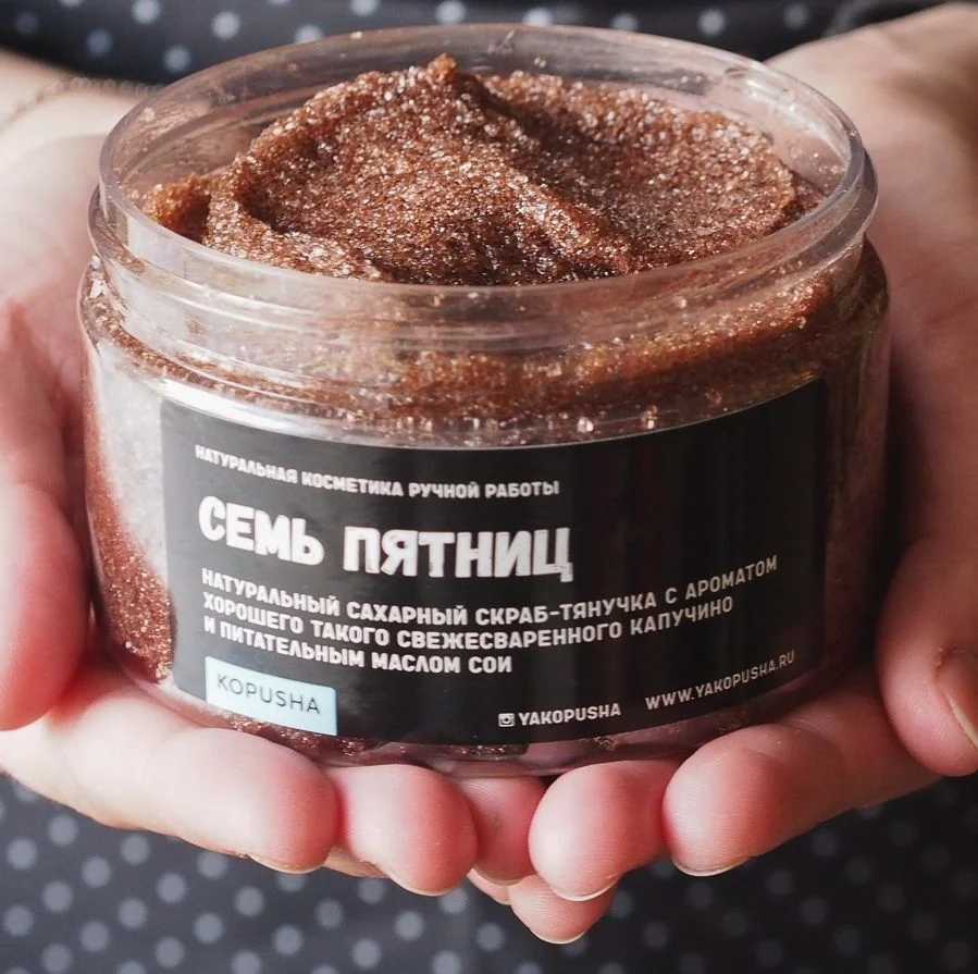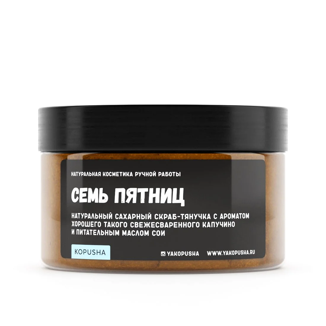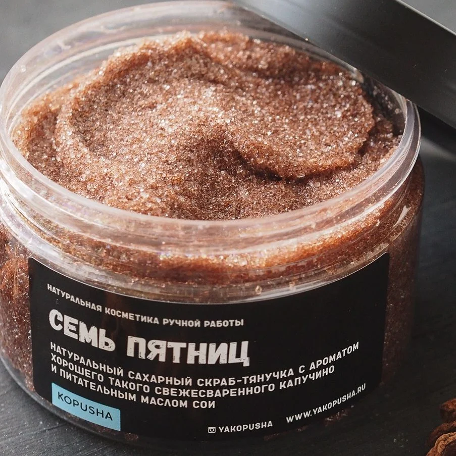Скраб-тянучка «Семь пятниц» от KOPUSHA - это темный скраб с ароматом капучино и маслами сои и кокоса. Он наполнит вашу ванну знакомым кофейно-сливочным ароматом и мягко очистит вашу кожу от ороговевших частиц благодаря сахарным гранулам.