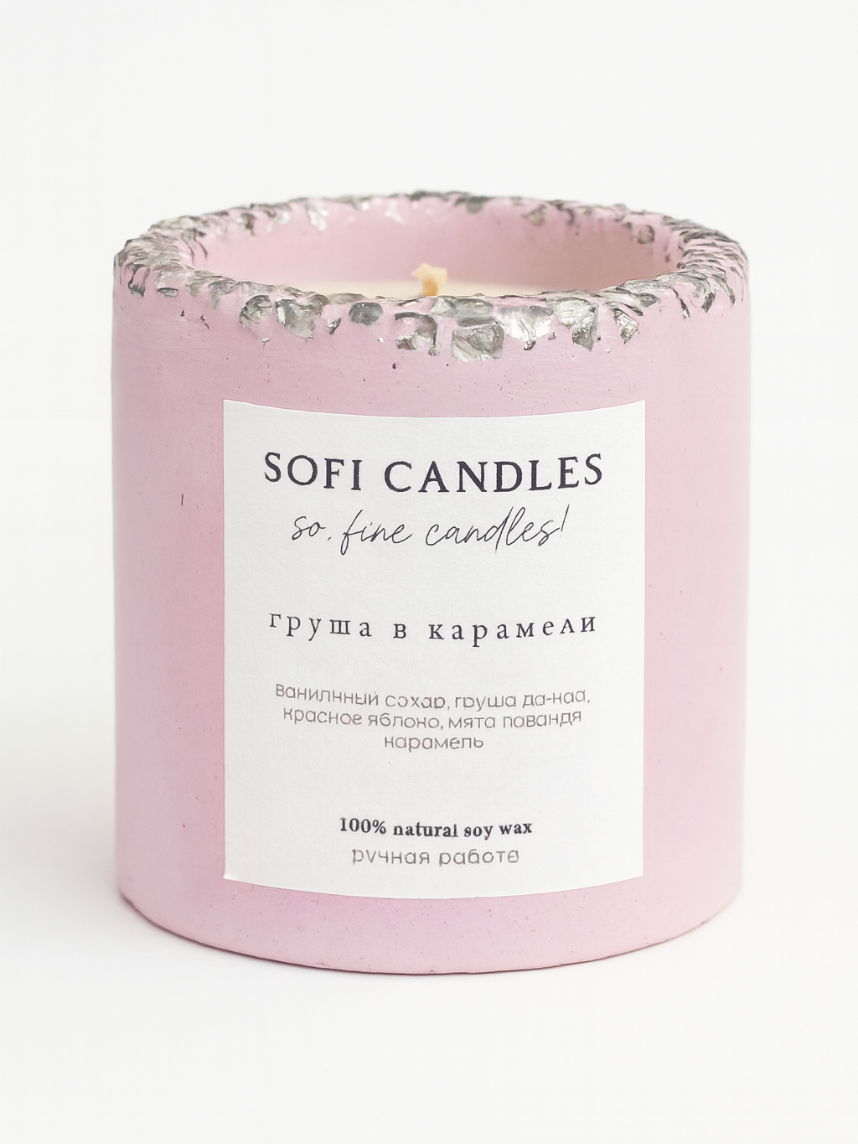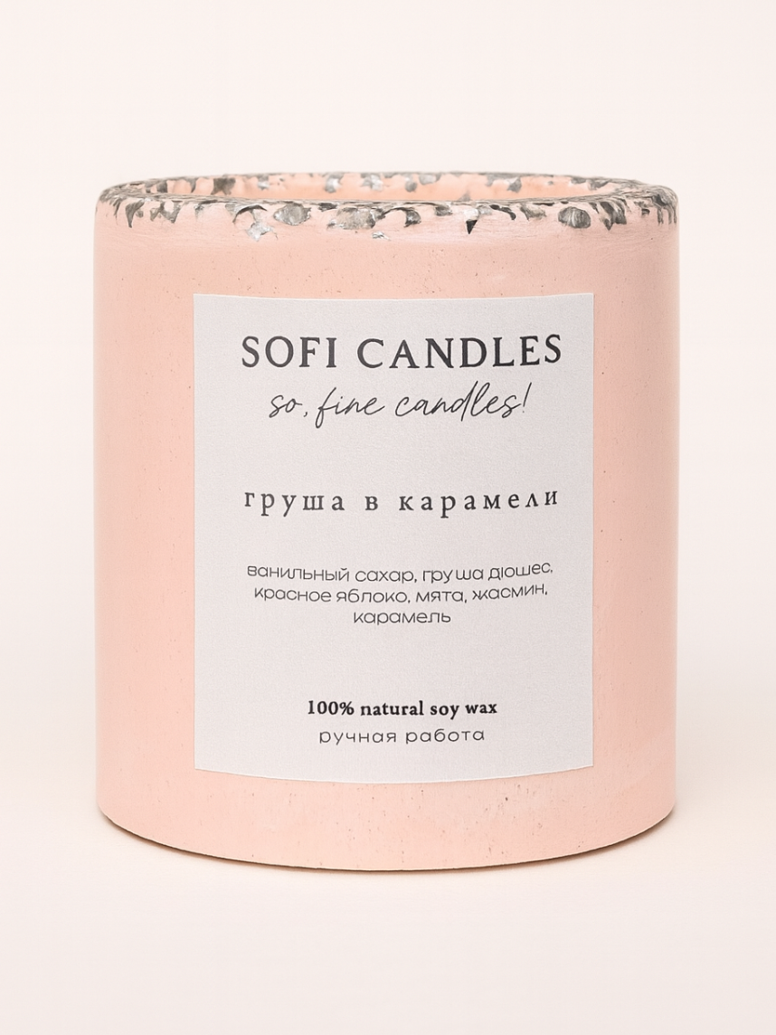 Соевая свеча ручной работы в гипсовом стакане ручной работы с ароматом груши в карамели от бренда SOFI candles с хлопковым фитилём.
