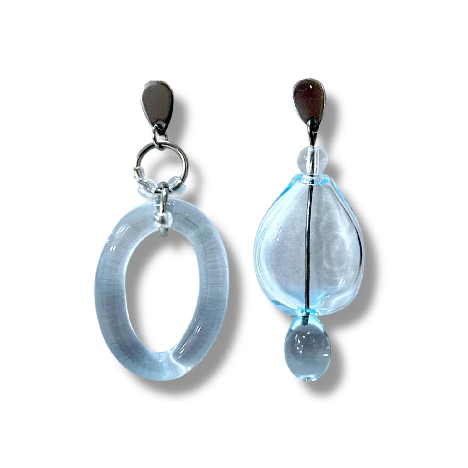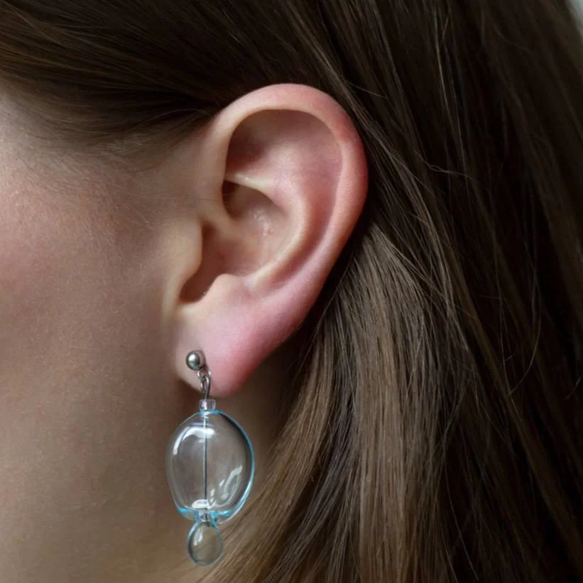 Стеклянные асимметричные серьги от бренда Lampjoy в голубом цвете.