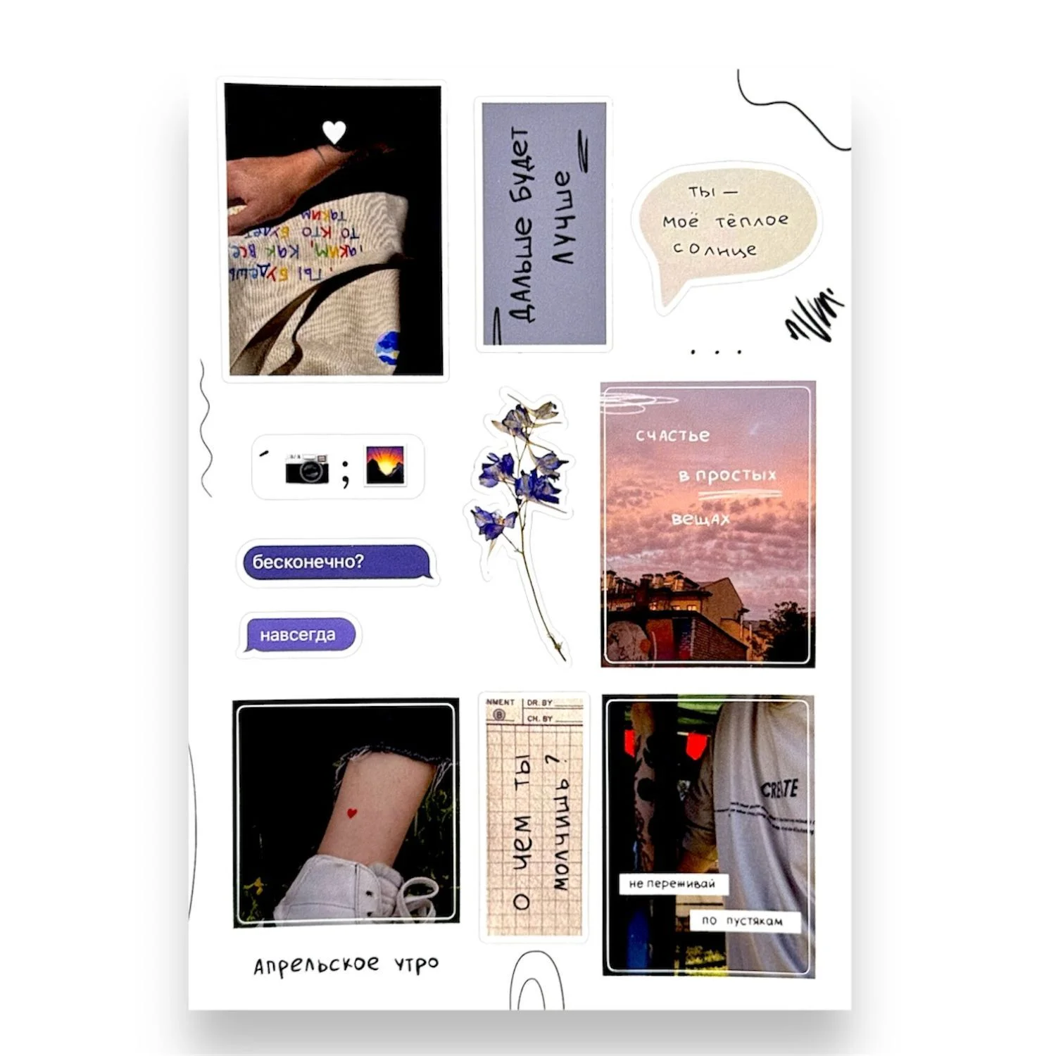 Вырубка по форме всех стикеров, размер А6, матовая виниловая пленка.