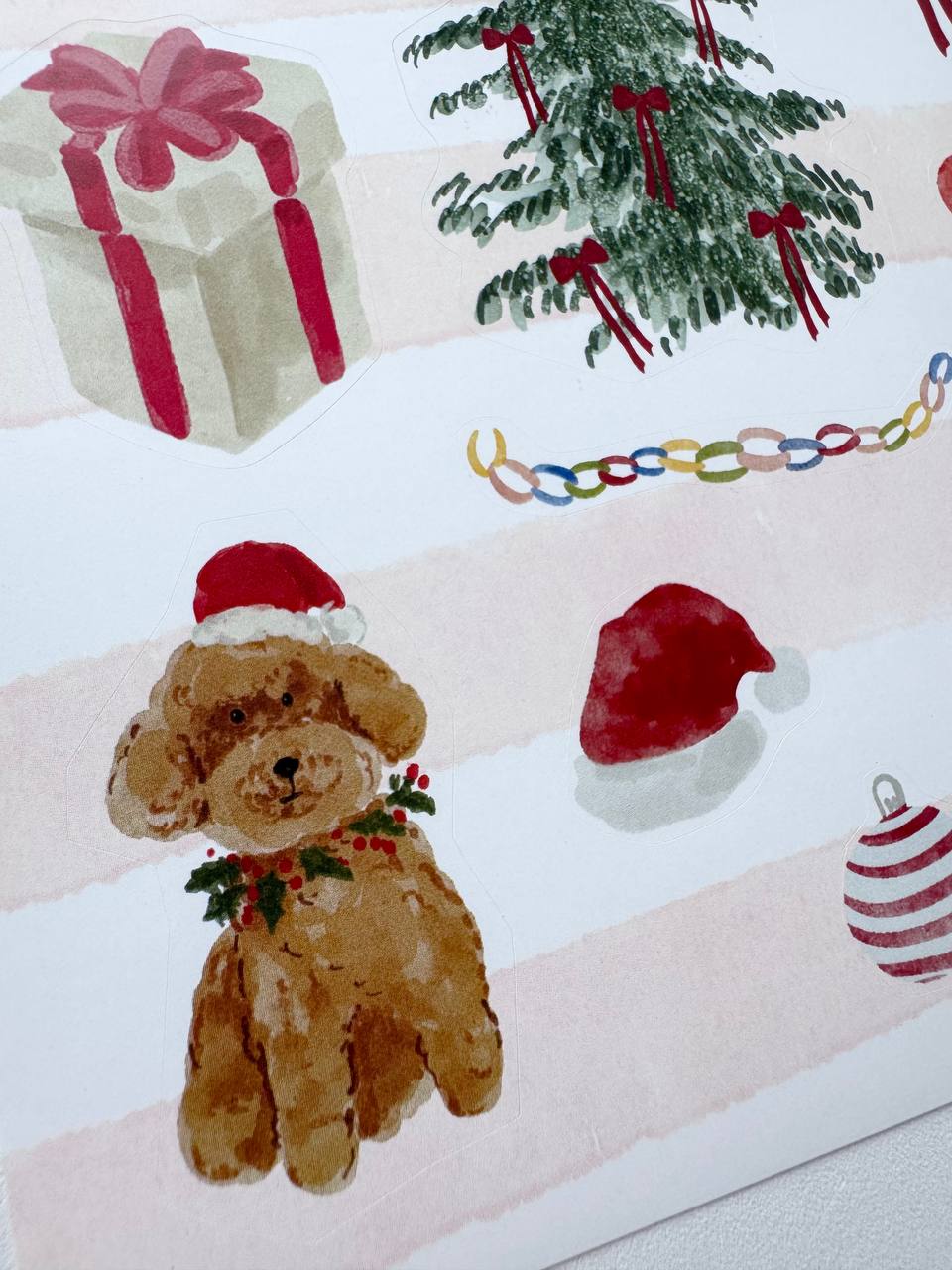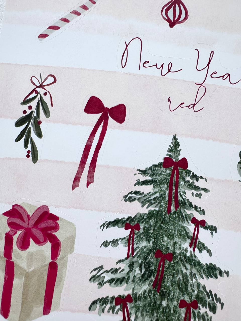В набор входят разнообразные праздничные элементы: елка, бантики, шары, подарки, надписи и другие тематические наклейки, созданные в современном и милом стиле.