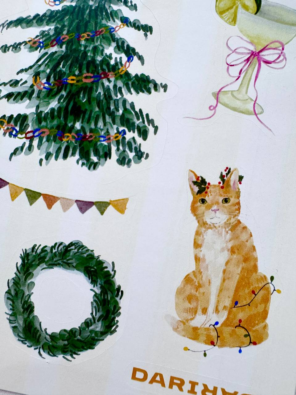 В набор входят разнообразные праздничные элементы: елка, бантики, шары, подарки, надписи и другие тематические наклейки, созданные в современном и милом стиле.