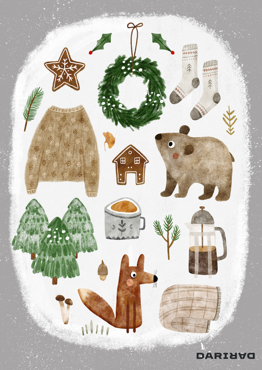 В набор входят разнообразные праздничные элементы: елка, венок, машинка, пряник, мишка, созданные в современном и милом стиле.