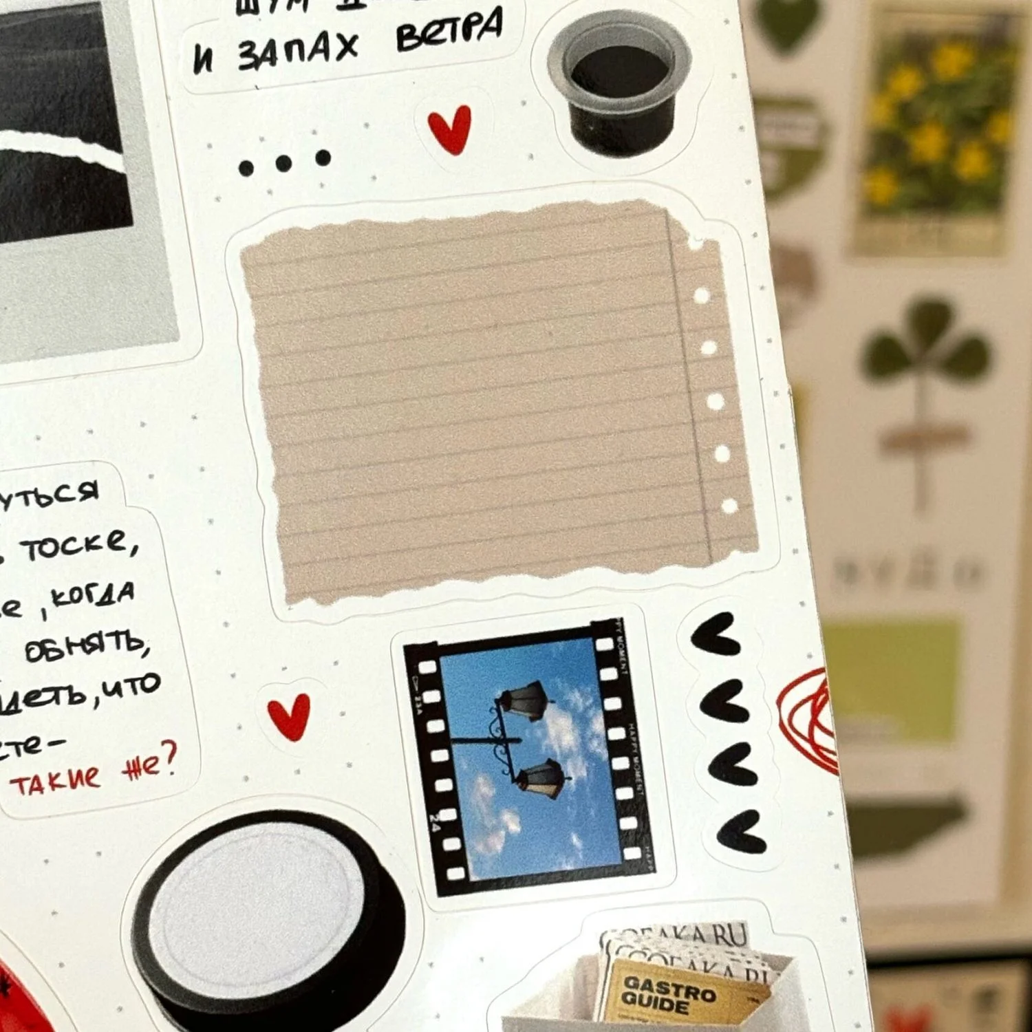 Вырубка по форме всех стикеров, размер А6, матовая виниловая пленка.