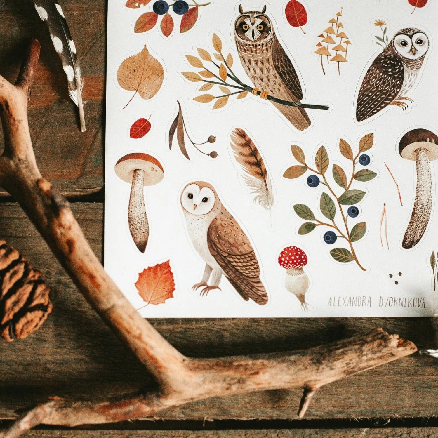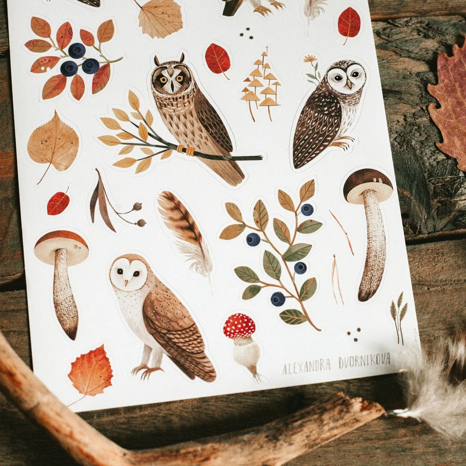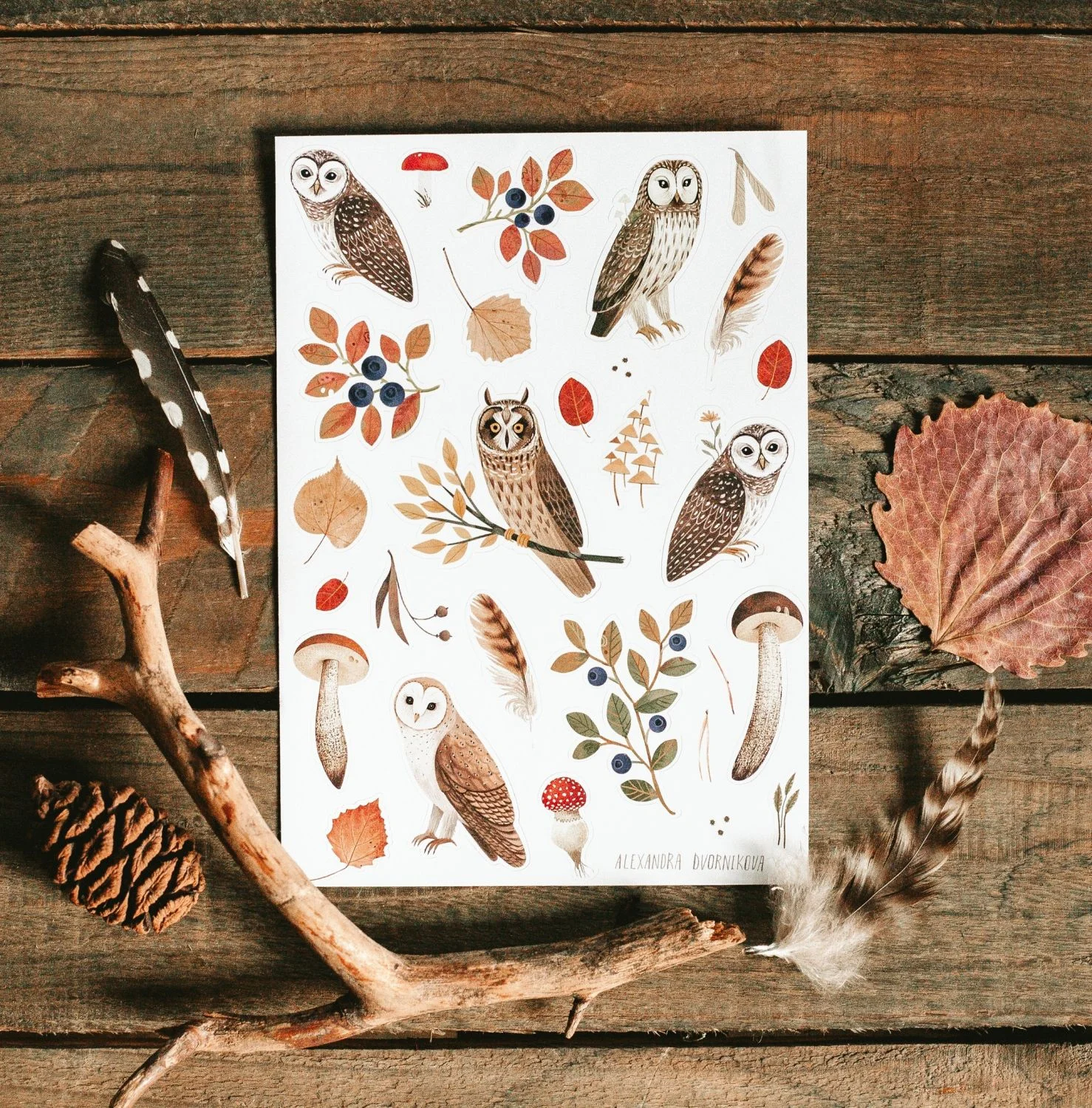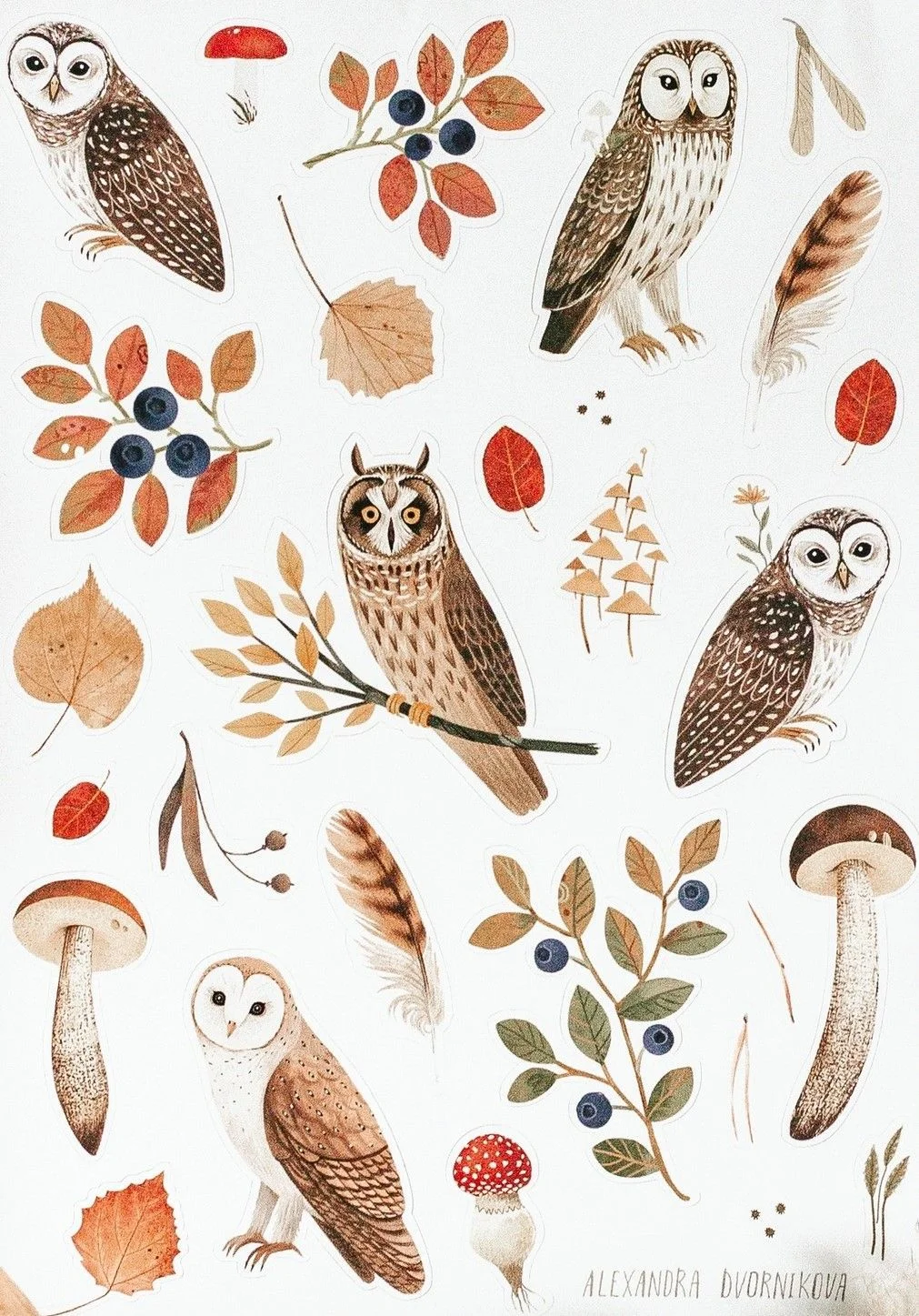 Лист стикеров с различными совами, черникой и грибами, 24 наклейки на матовом виниле.