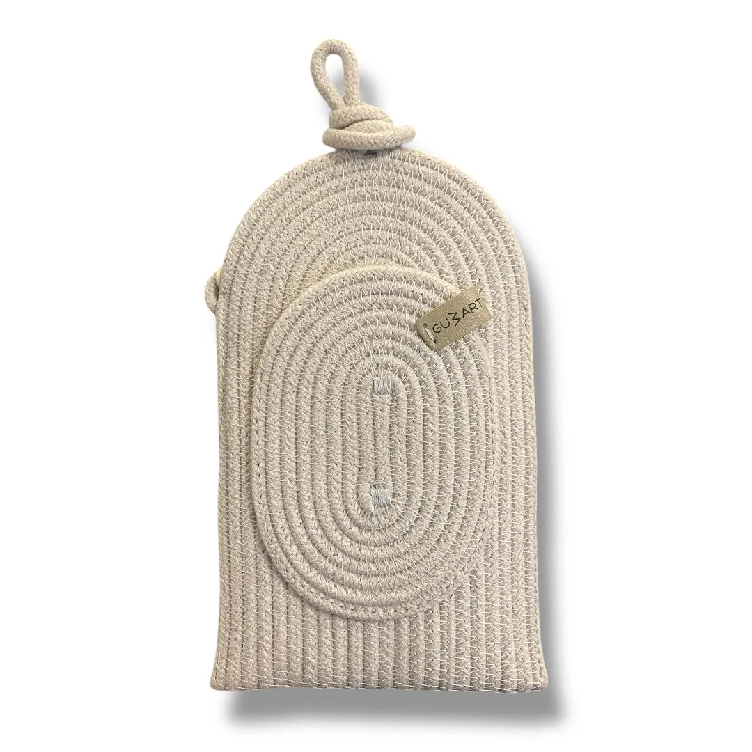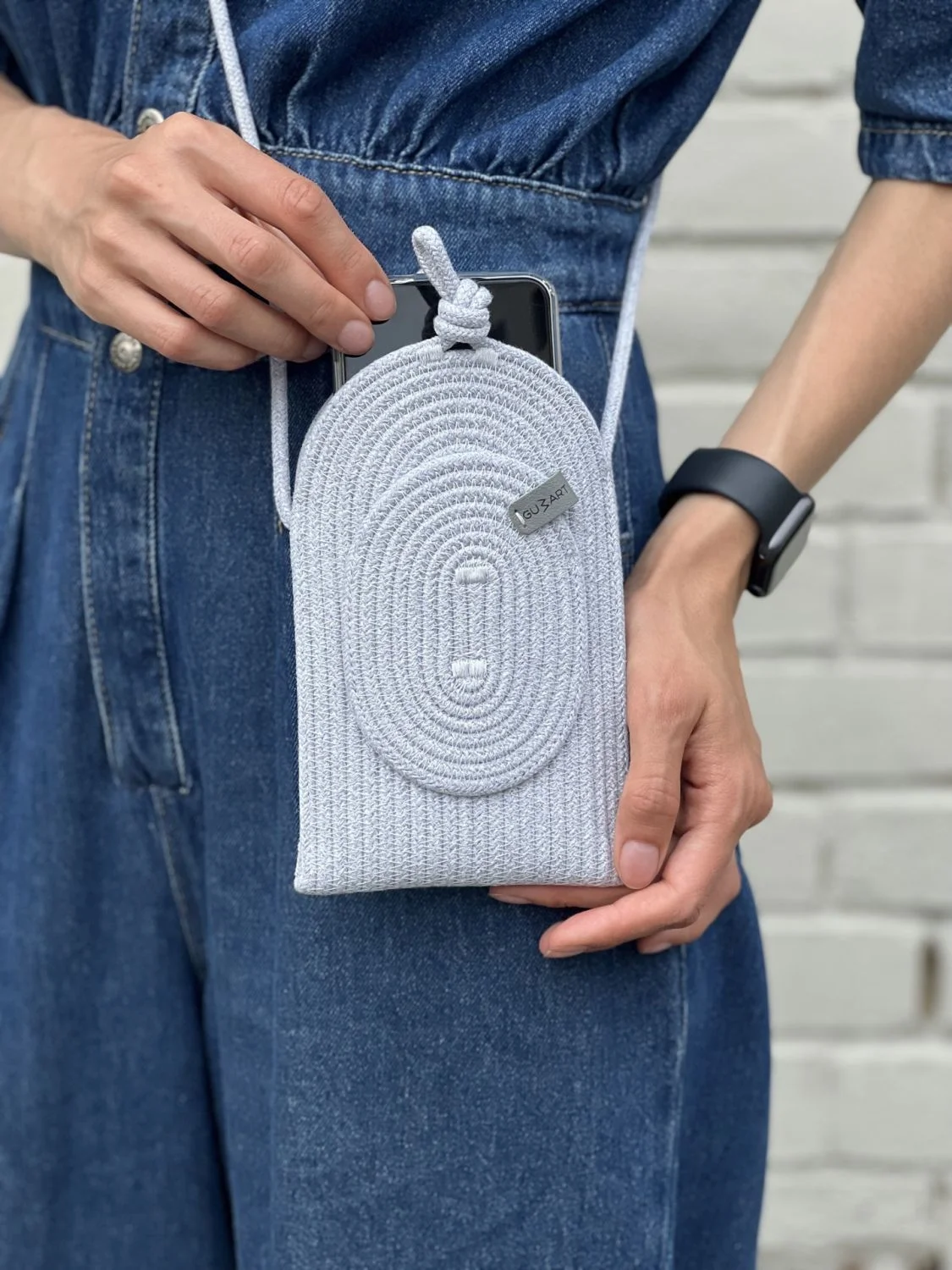 Сумка-чехол для телефона из 100% хлопкового шнура, бирка из натуральной кожи.