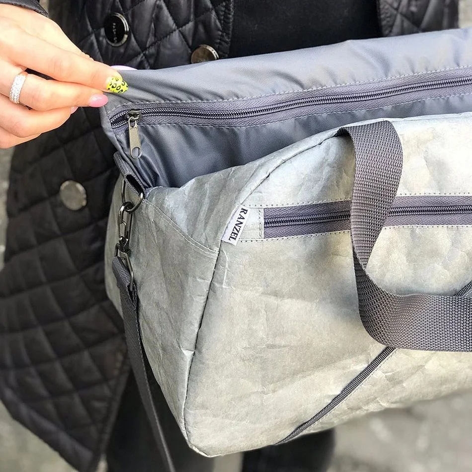 Сумка Hunty Gray выполнена из необычного Крафт материала Tyvek (Тайвек), который устойчив к дождю и снегу, его можно даже мыть в стиральной машине, в холодной воде. Материал ультра легкий и прочный.