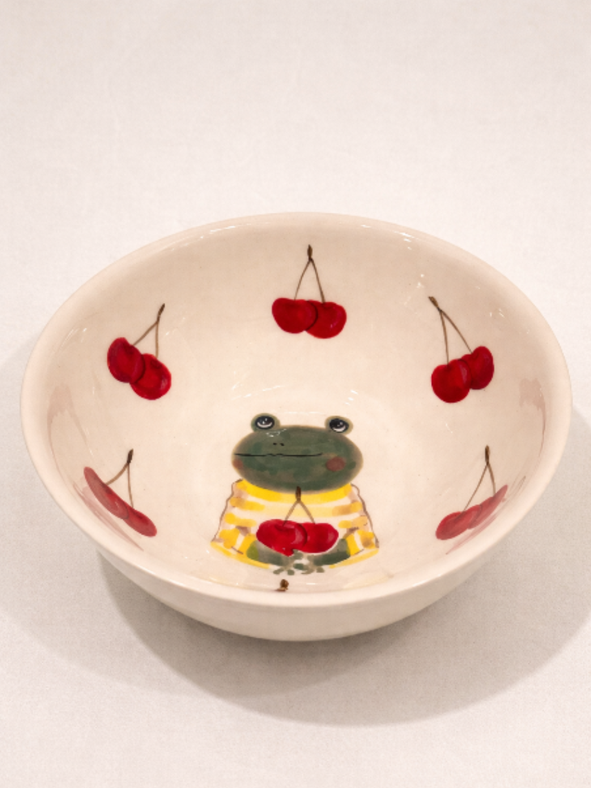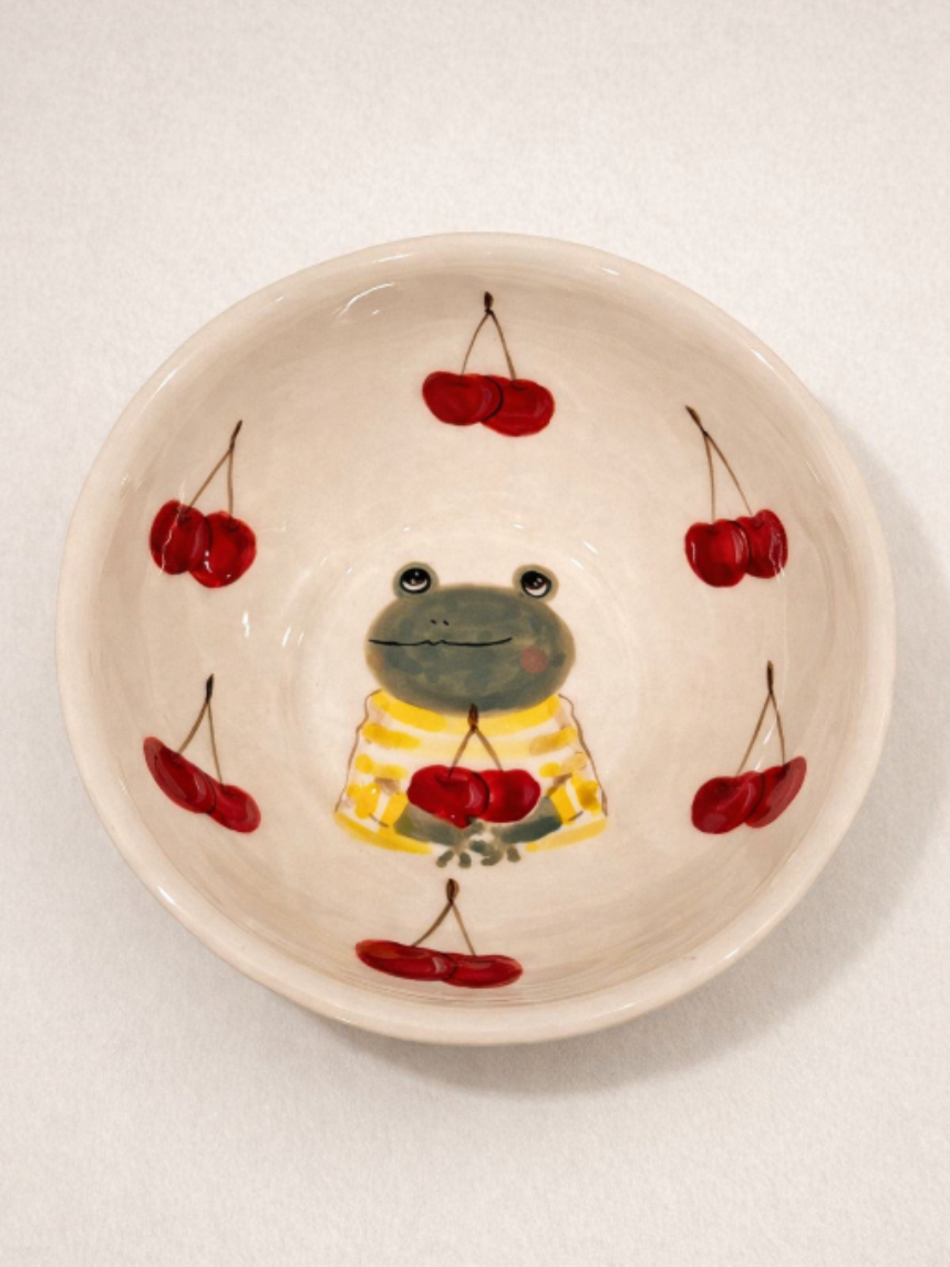 Тарелка глубокая ручной работы Ким керамика Лягушка с вишенками, белая, фарфор, 12 см
