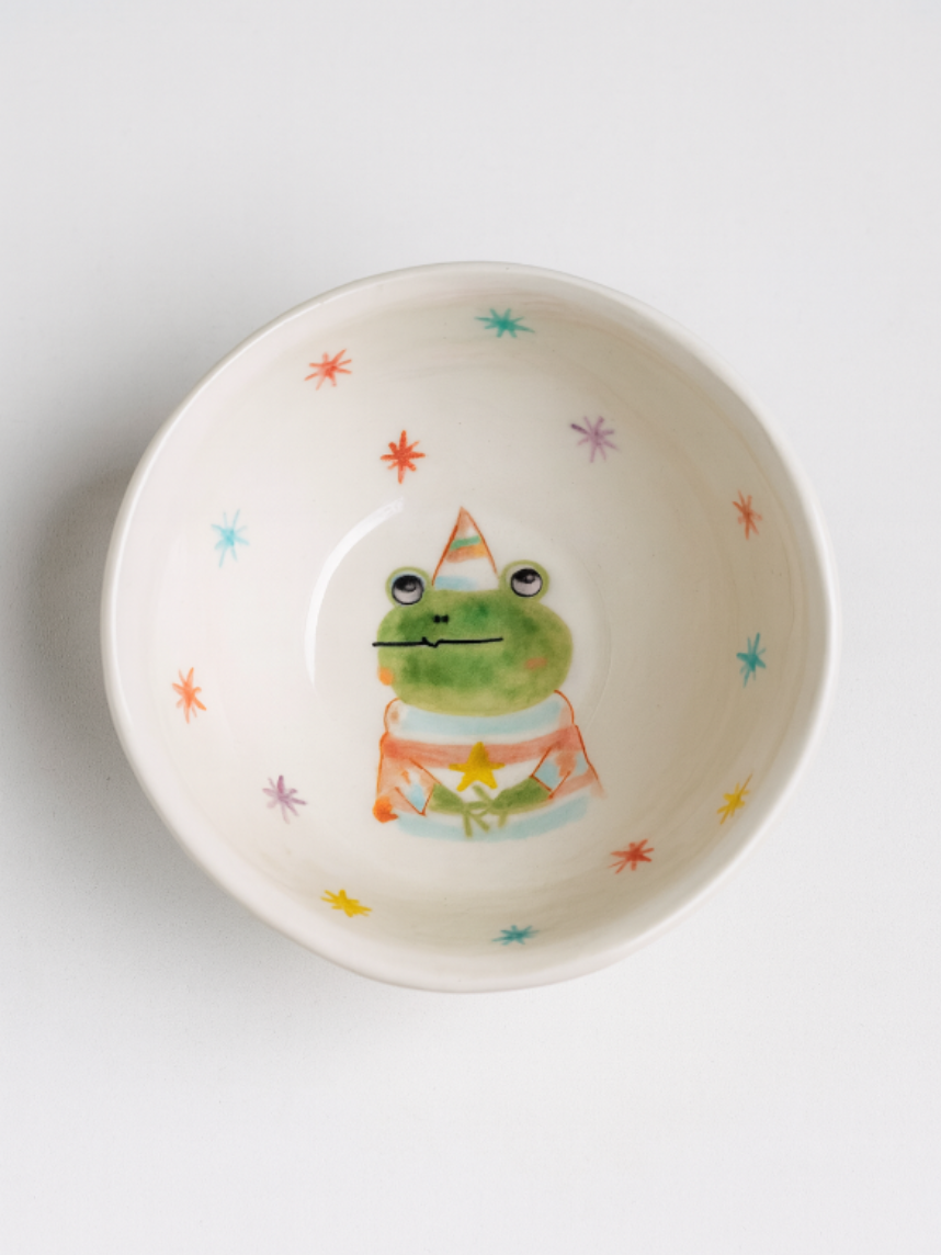 Тарелка глубокая ручной работы Лягушка в колпаке, белая, фарфор, 12 см