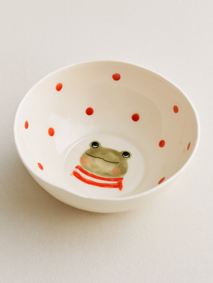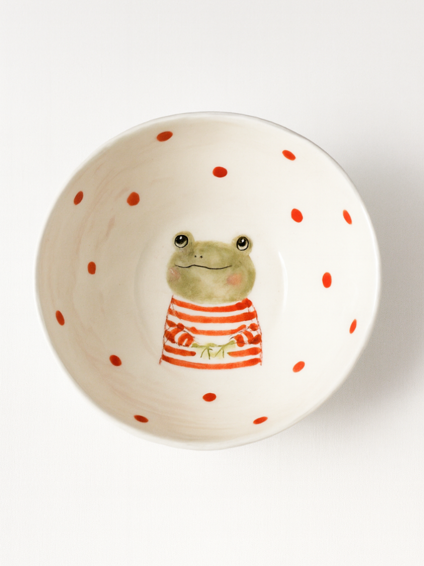 Тарелка глубокая ручной работы Лягушка в полосатом свитере, белая в красный горошек, фарфор, 12 см