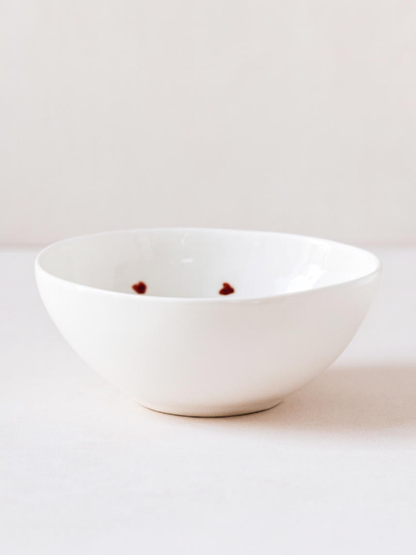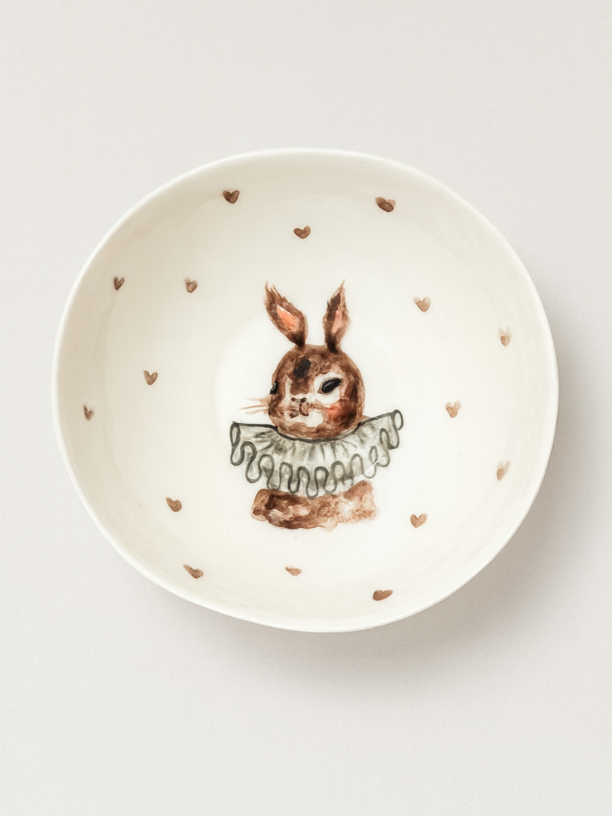 Тарелка глубокая ручной работы Зайка в жабо с сердечками, белая, фарфор, 12 см