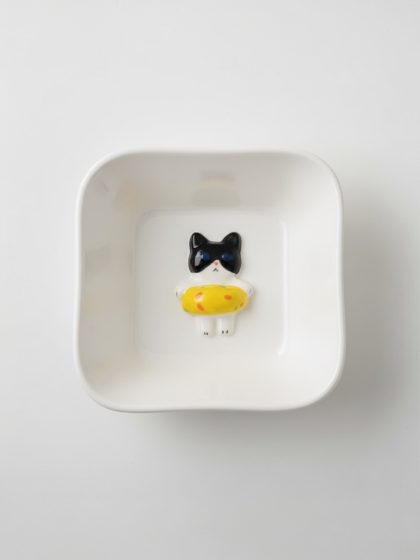 Тарелка квадратная с фигуркой внутри Котик-пончик, чёрный, керамика, 14 см