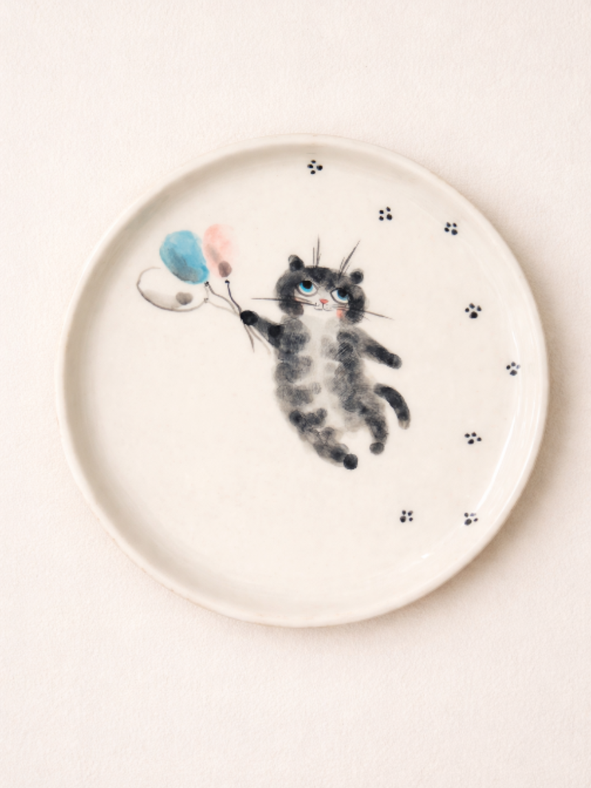 Тарелка ручной работы с бортиком «Чёрный кот с воздушными шариками». Производитель - керамистка Ситникова Юлия (Kim.ceramics).