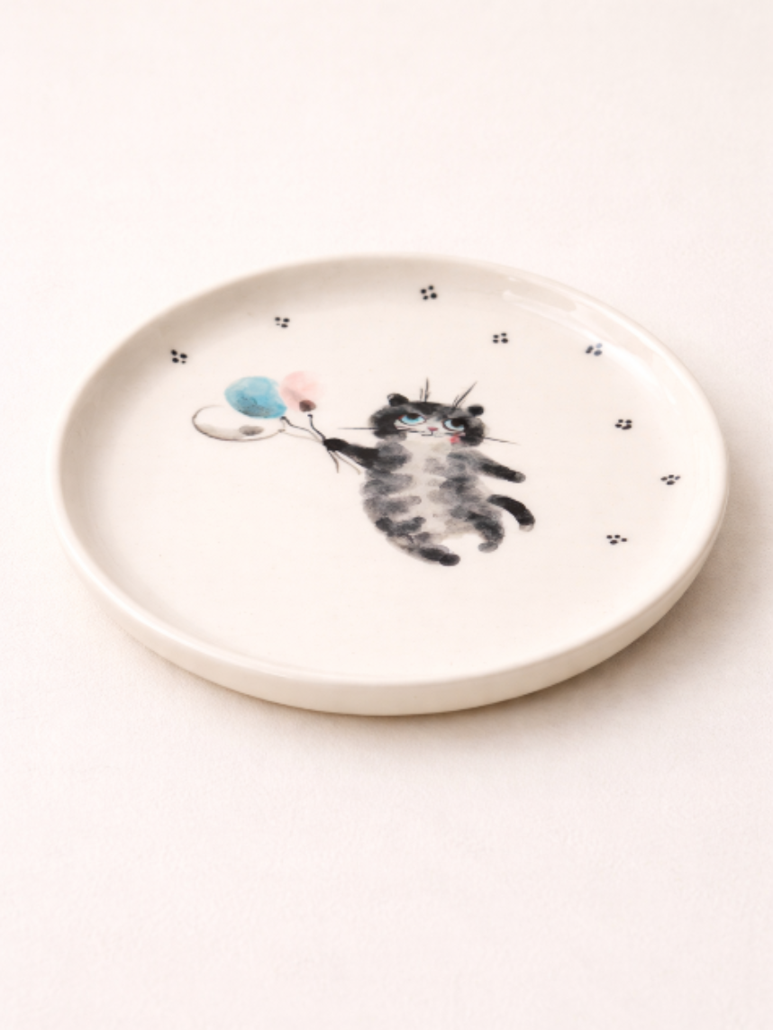 Тарелка ручной работы Ким керамика с бортиком «Чёрный кот с воздушными шариками», белая, фарфор, 14 см