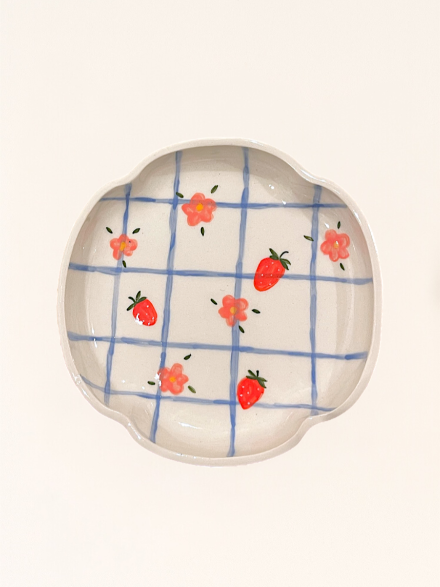 Тарелка ручной работы «Клетка с клубникой и цветочками», керамика, 15 см