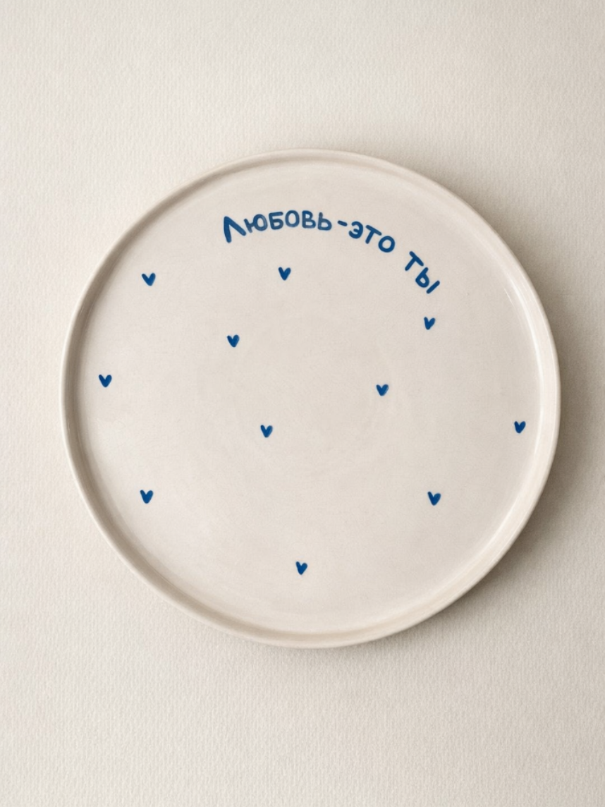 Тарелка ручной работы РУКИ В ГЛИНЕ «Любовь-это ты», голубая, полуфарфор, 21 см
