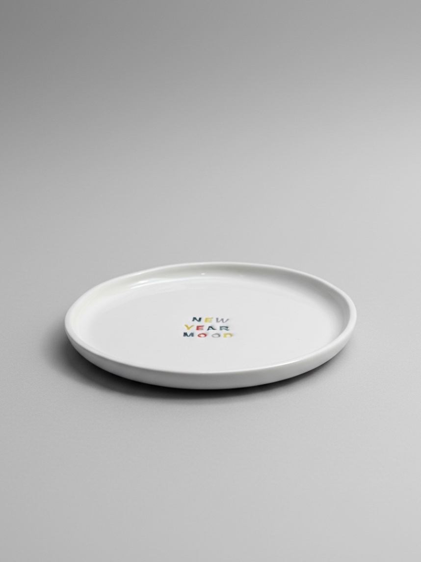 Тарелка ручной работы на Новый год с надписью «New Year Mood» — оригинальное и выразительное изделие из керамики диаметром 18 см.