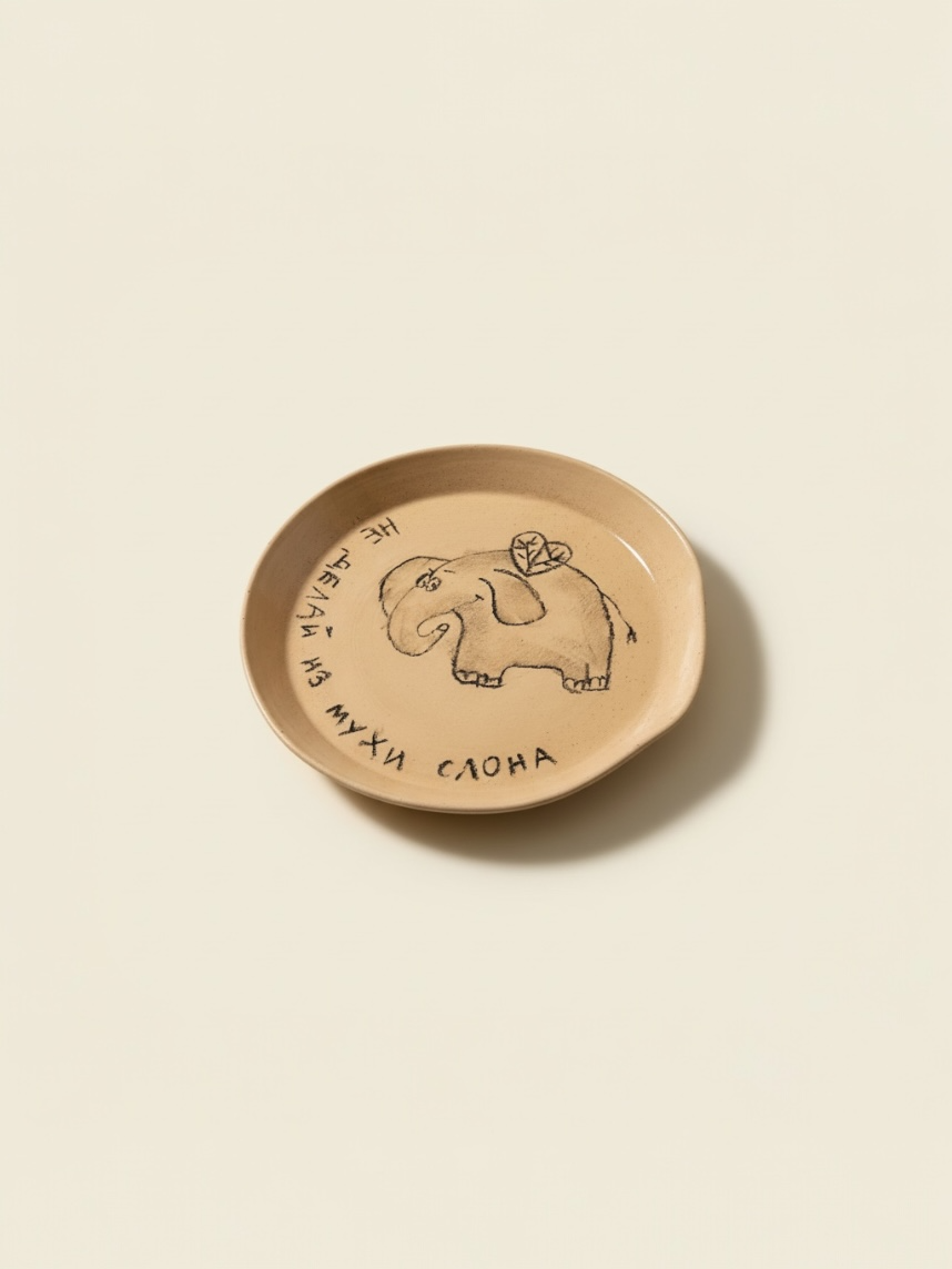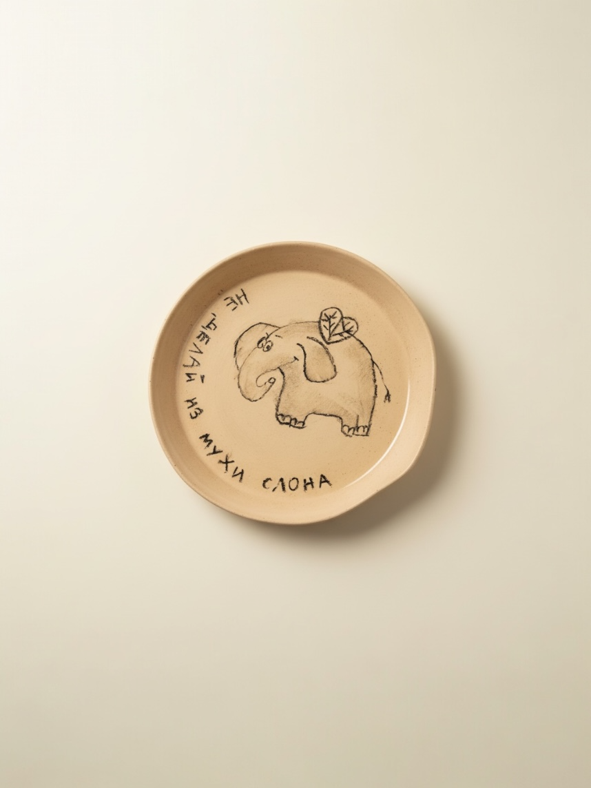Керамическая тарелка ручной работы «Не делай из мухи слона» прекрасно подойдёт для завтраков или горячих блюд.