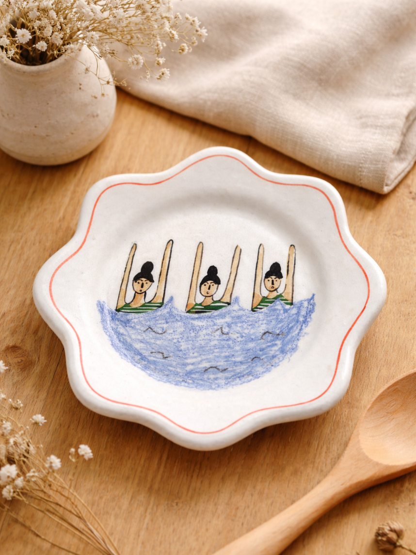 Тарелка ручной работы «Плавание» с росписью, для утонченного интерьера.