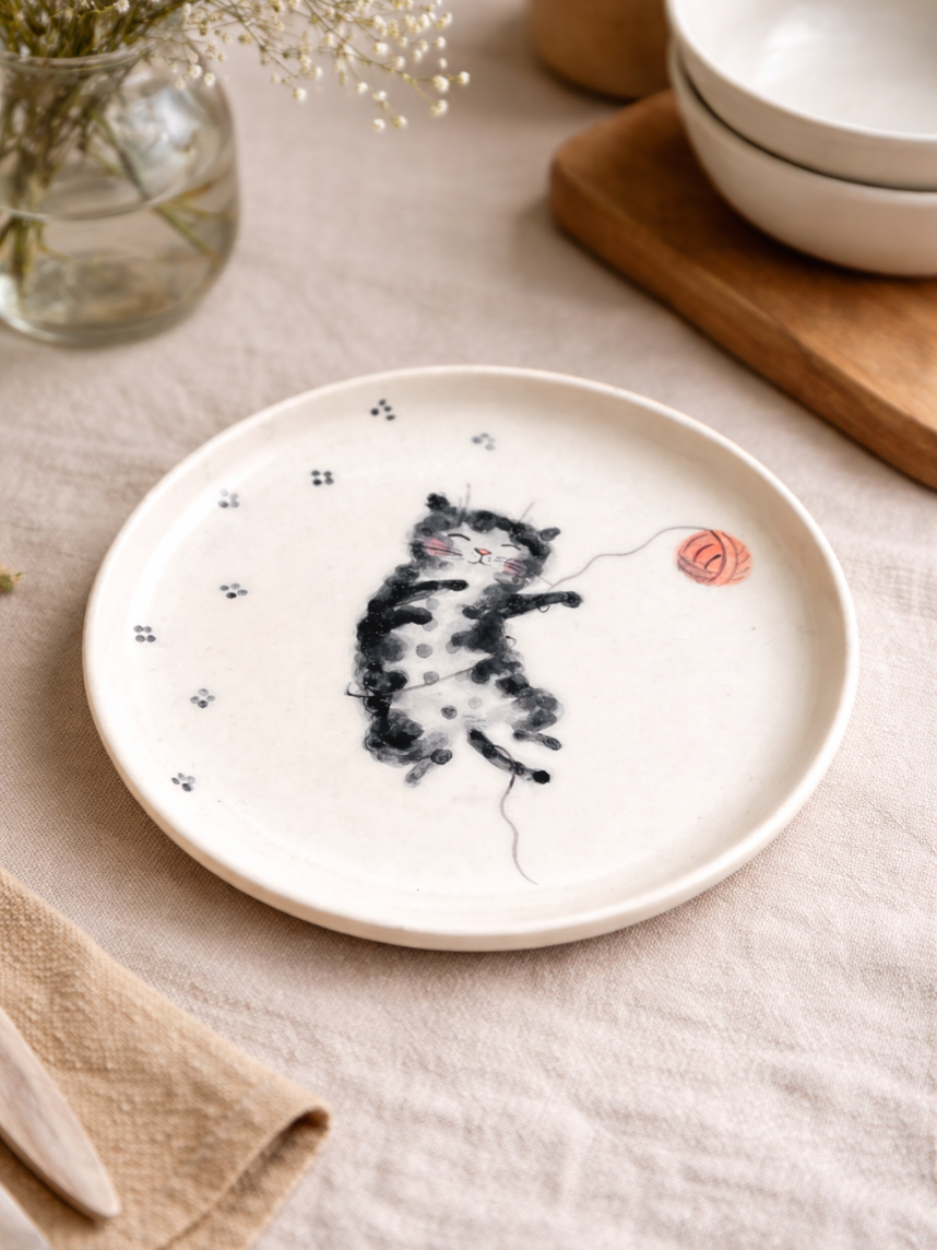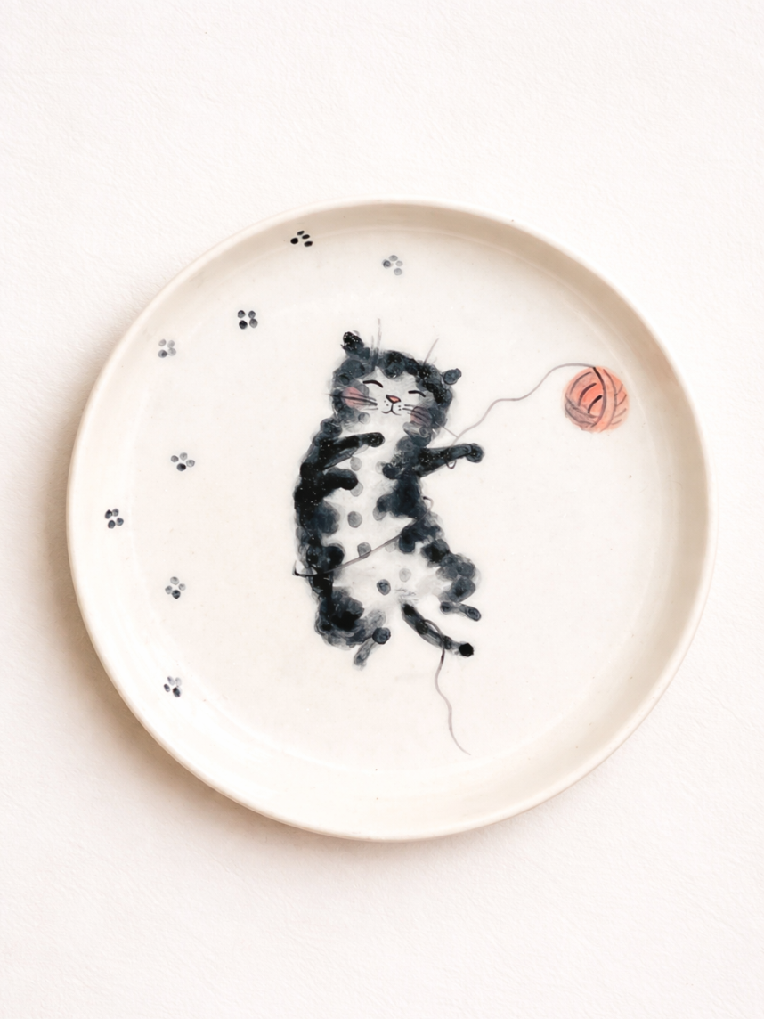 Тарелка ручной работы с бортиком «Котик с клубочком». Производитель - керамистка Ситникова Юлия (Kim.ceramics).