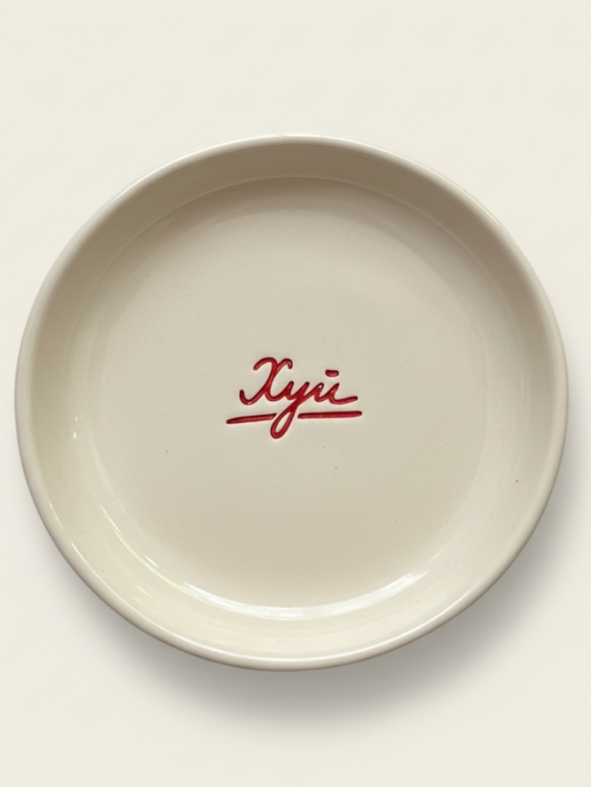 Тарелка ручной работы с провокационной надписью. Производитель - петербургский бренд Katya Hyena.