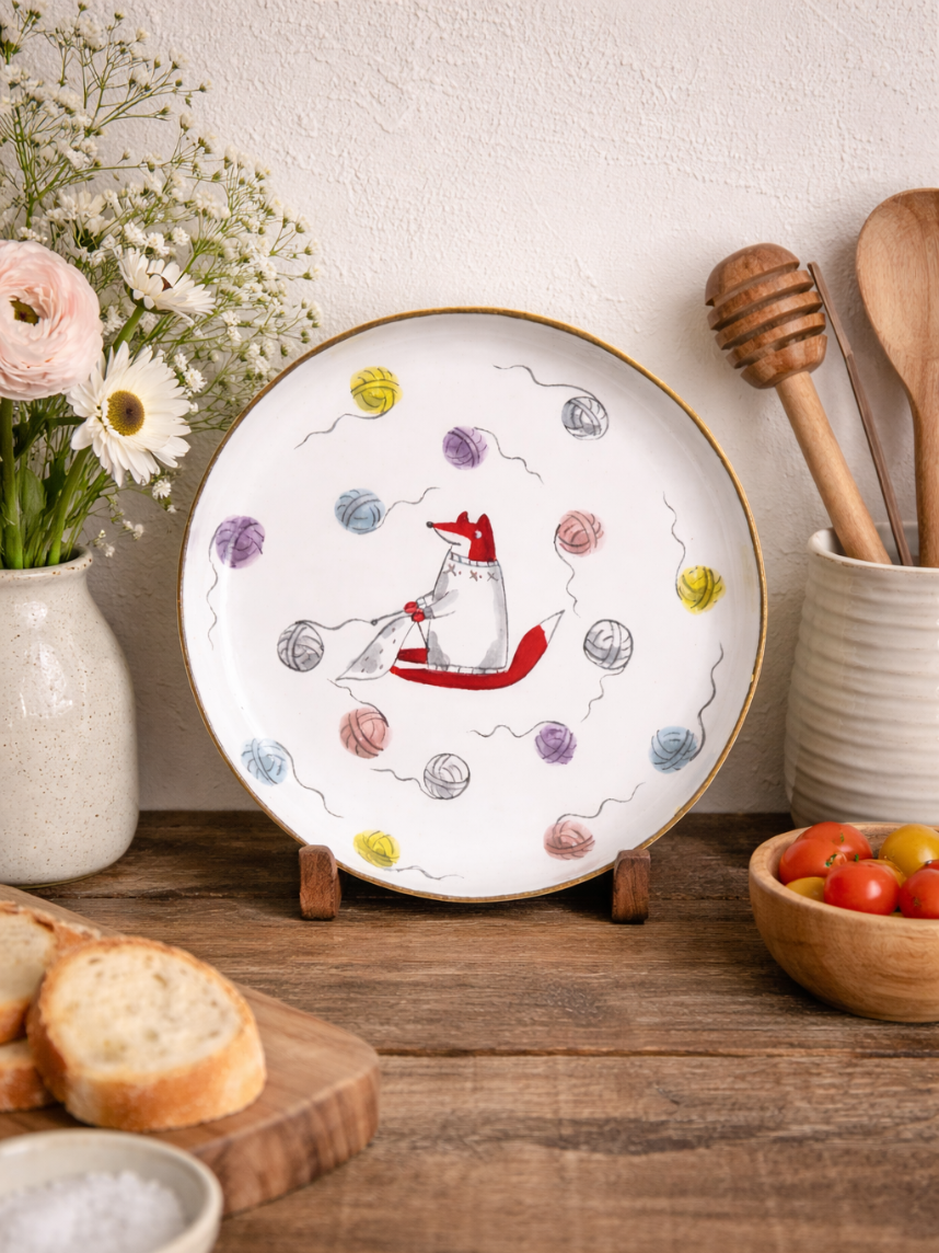 Тарелка ручной работы с бортиком Лис и клубочки пряжи, белая, 17 см