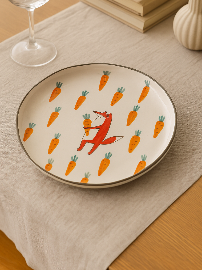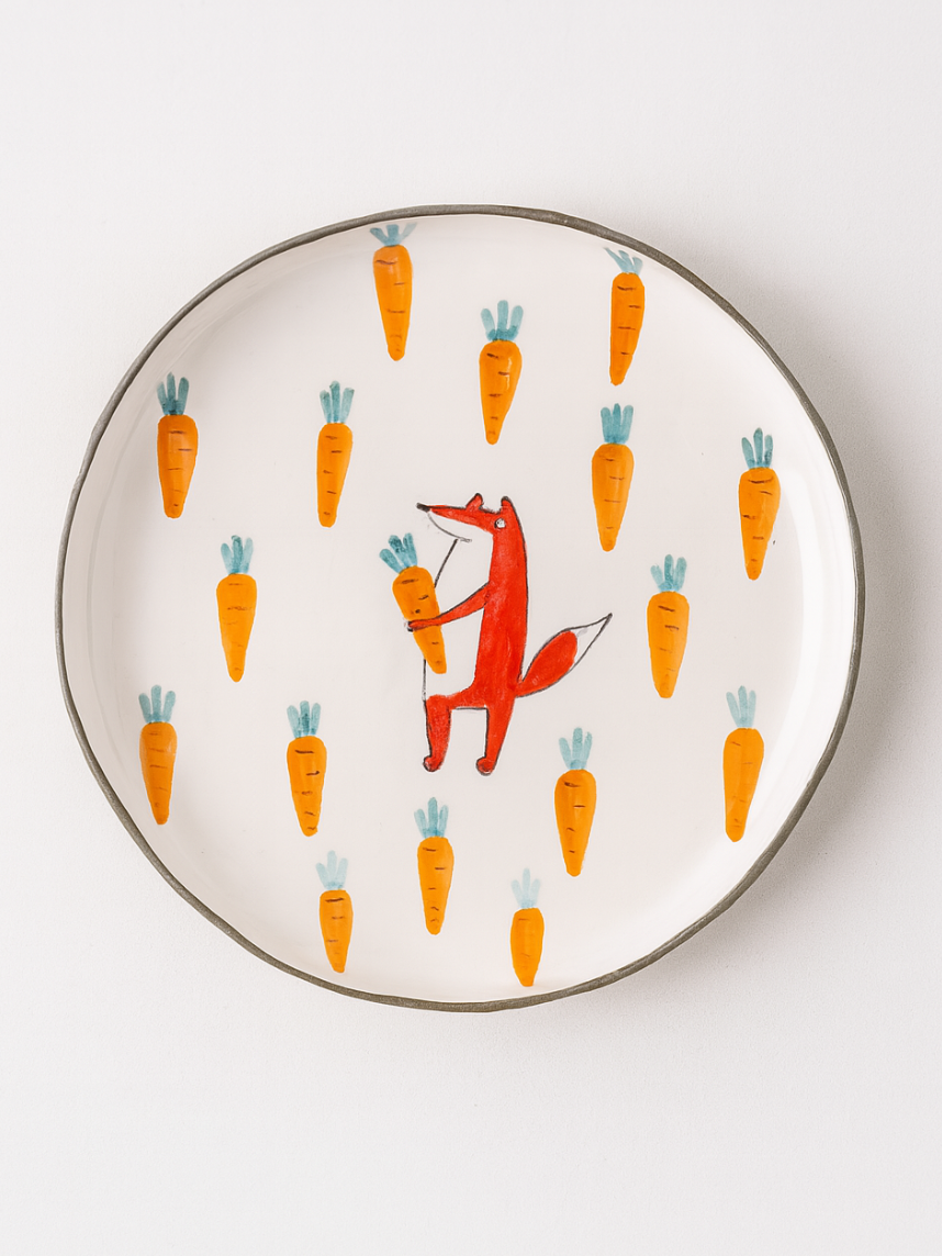 Керамическая тарелка ручной работы с бортиком «Лис с морковкой». Производитель - керамистка Ситникова Юлия (Kim.ceramics).