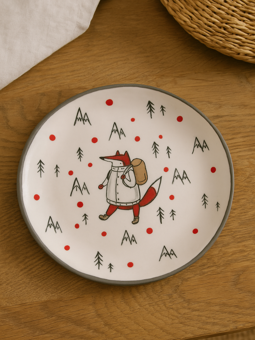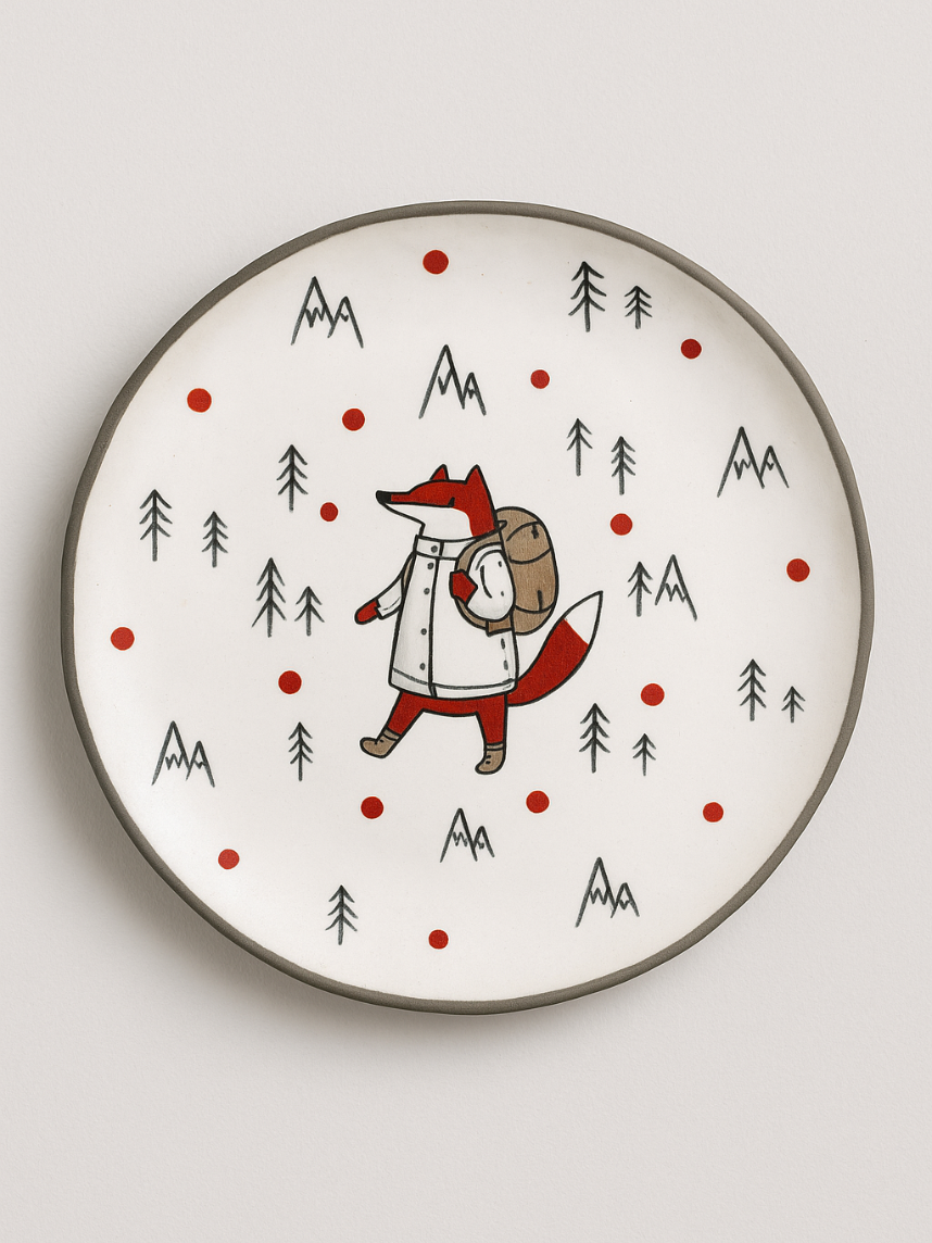 Тарелка ручной работы с бортиком Лис в горах, белая, 17 см