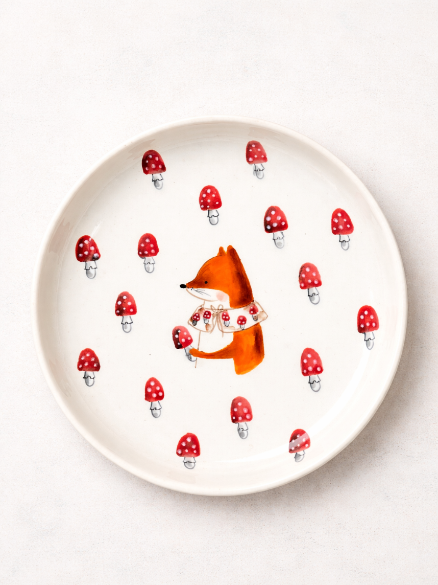 Тарелка ручной работы с бортиком «Лисёнок с мухоморами». Производитель - керамистка Ситникова Юлия (Kim.ceramics).