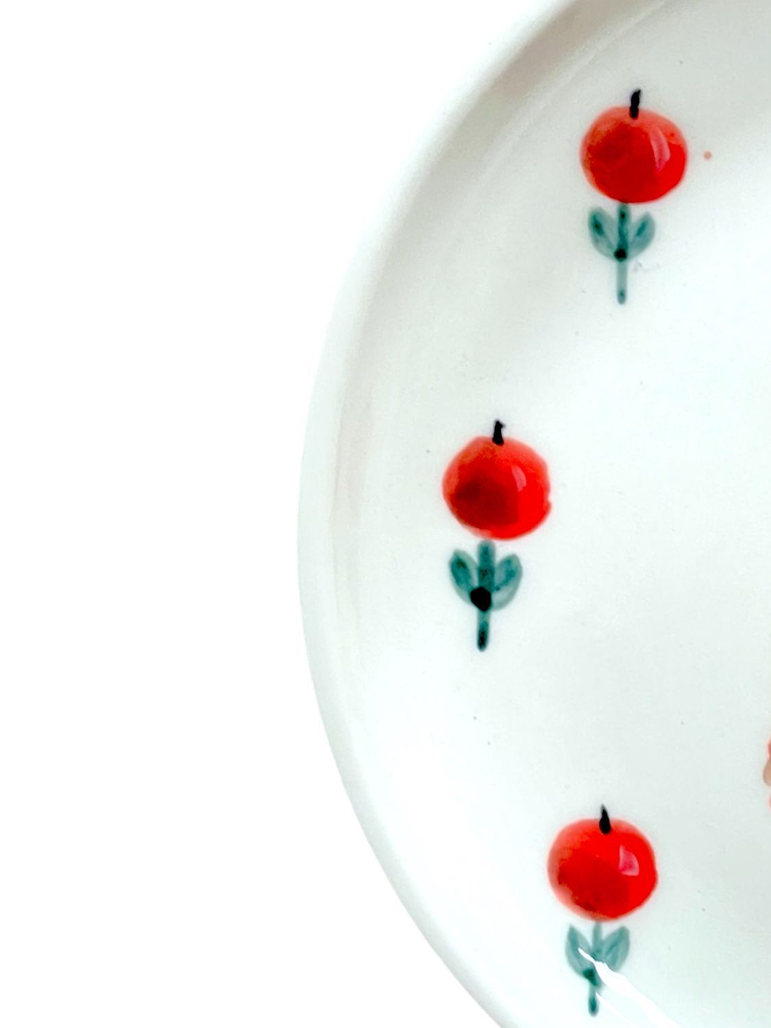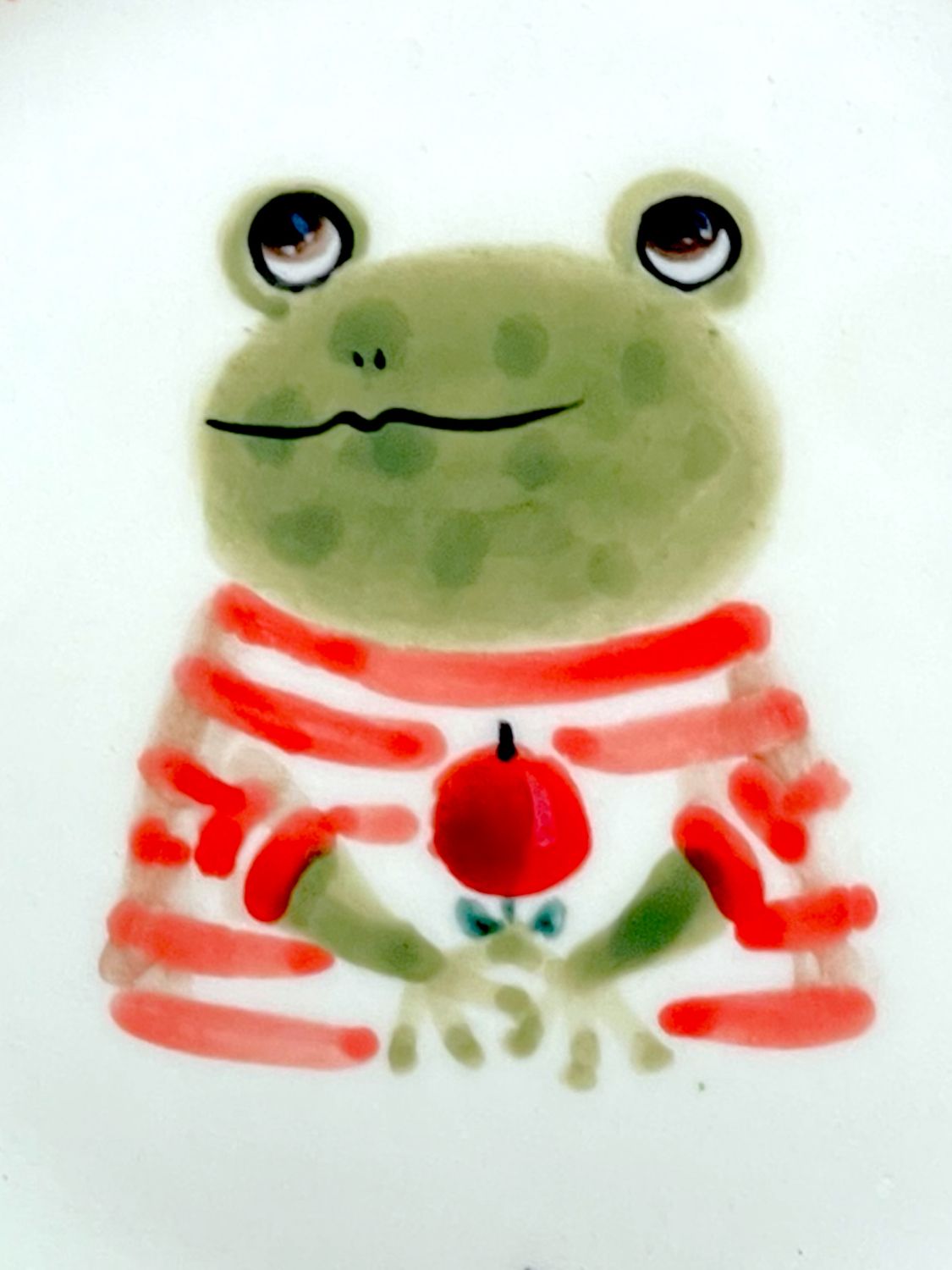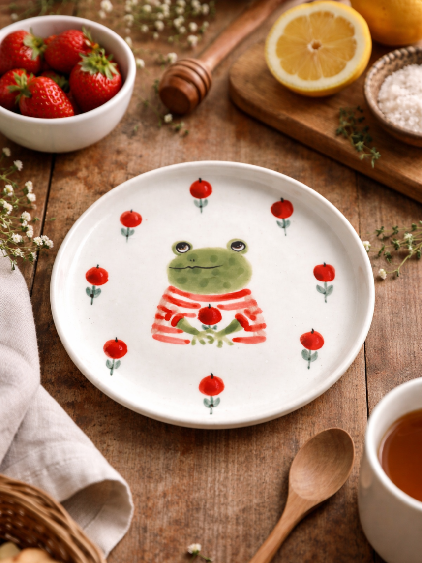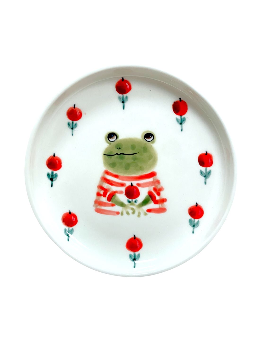 Тарелка ручной работы с бортиком Лягушка с красными ягодками, белая, фарфор, 13 см