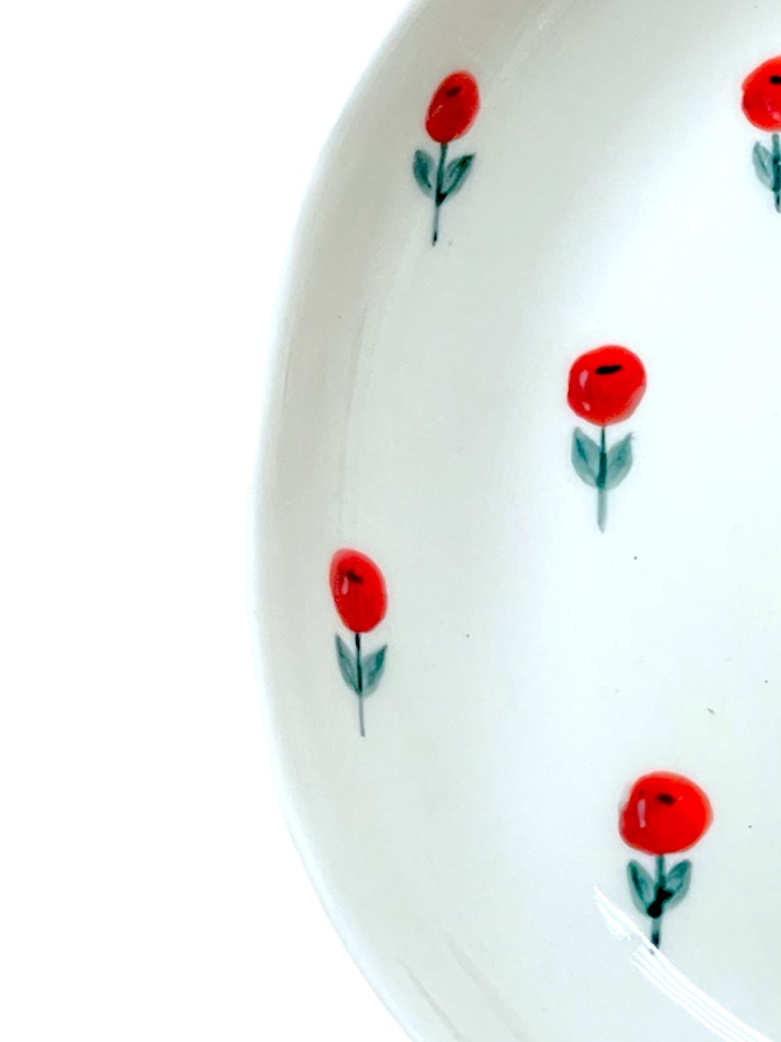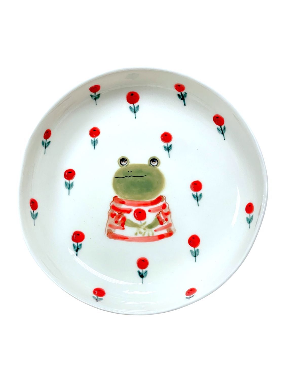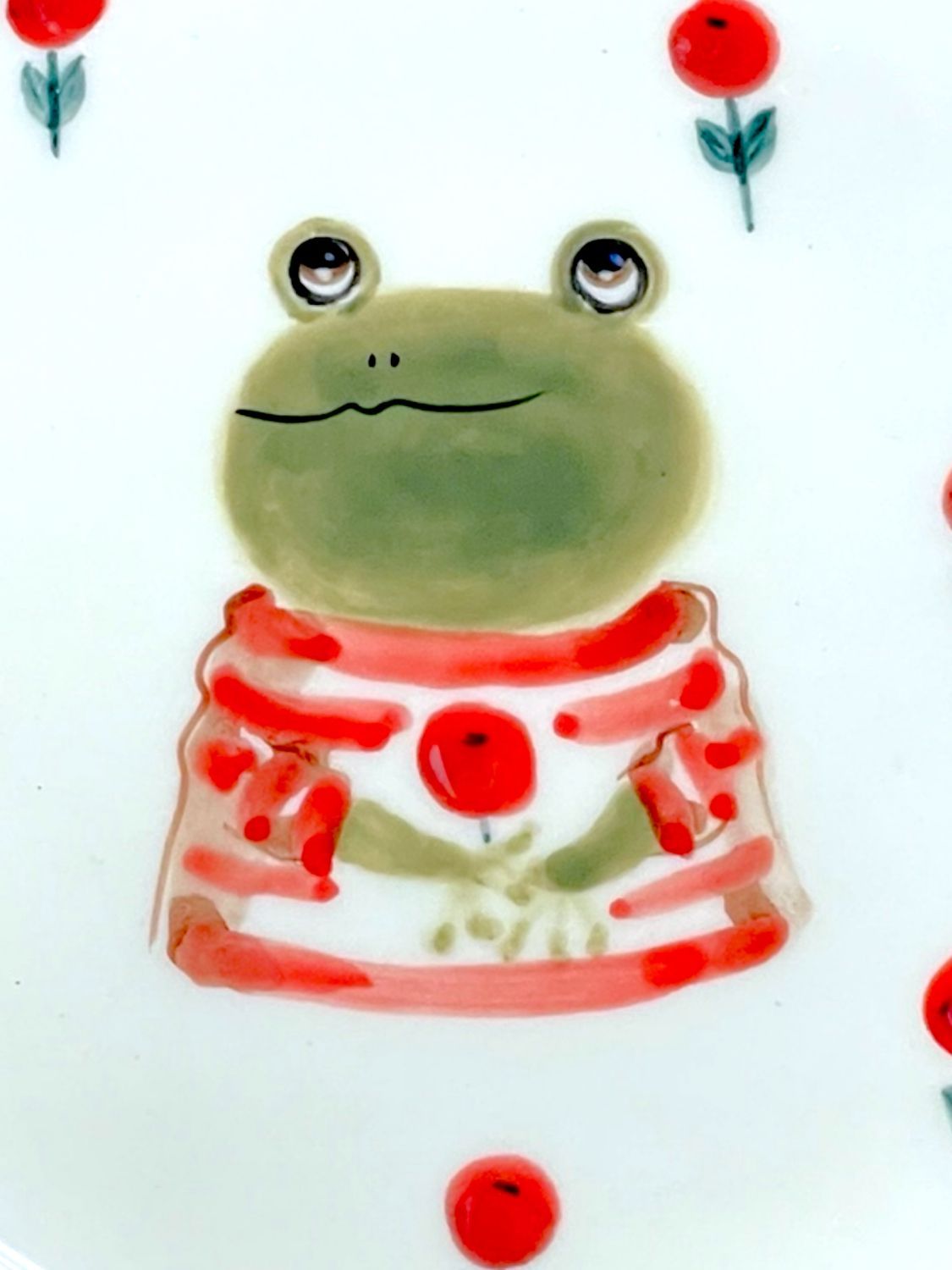 Тарелка ручной работы с бортиком Лягушка с красными ягодками, белая, фарфор, 16 см