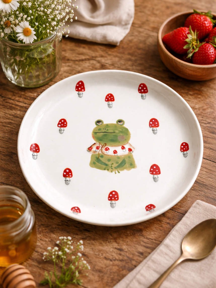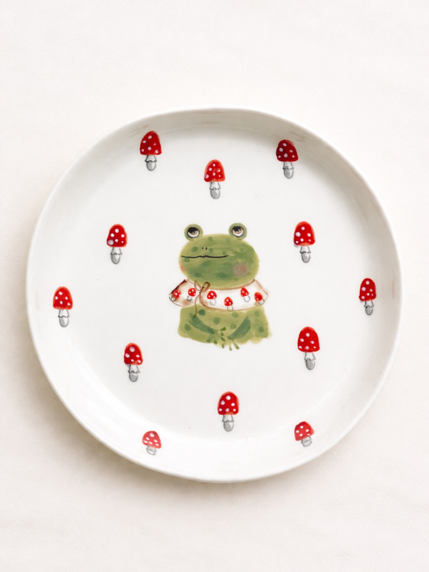 Тарелка ручной работы с бортиком «Лягушка с мухоморами». Производитель - керамистка Ситникова Юлия (Kim.ceramics).