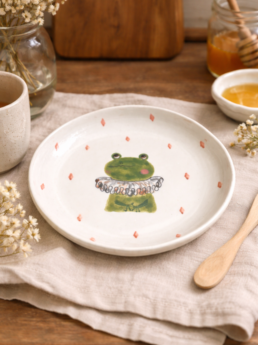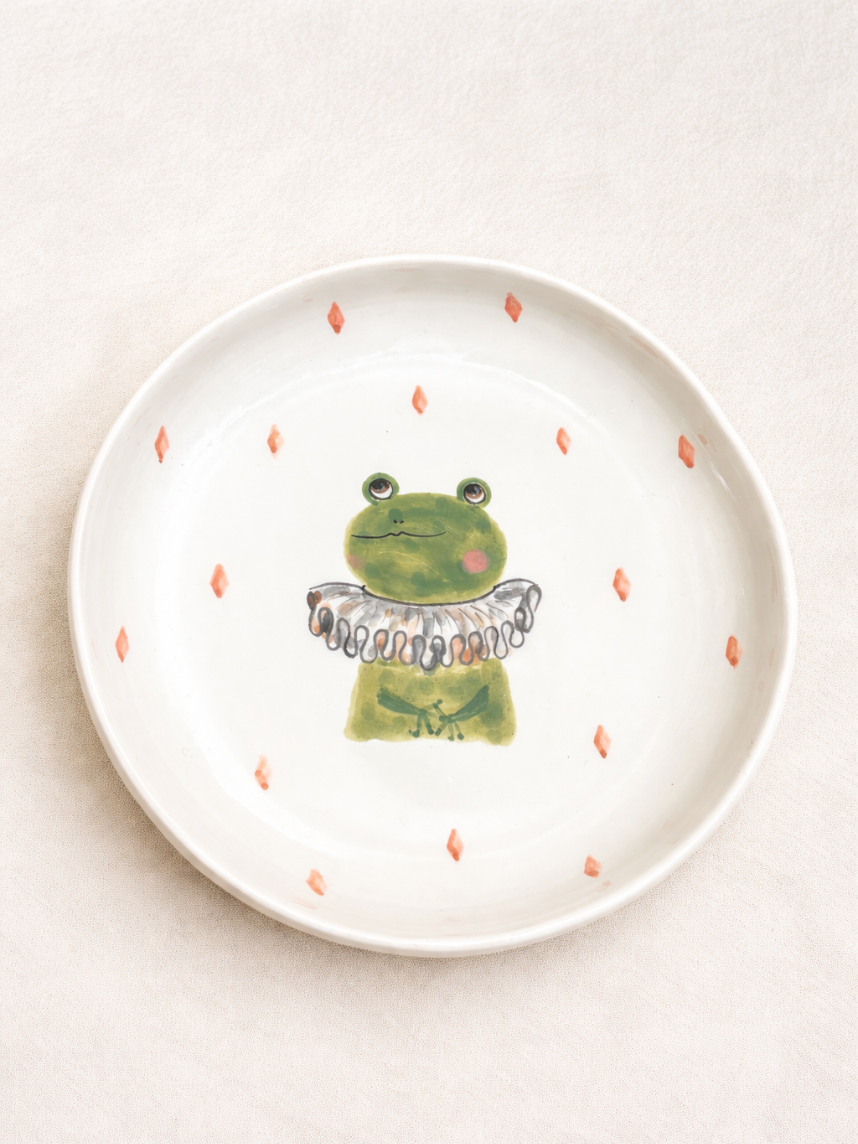 Тарелка ручной работы с бортиком Лягушка в жабо с ромбиками, белая, 17 см