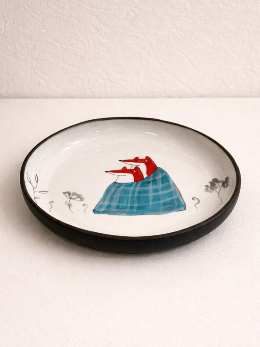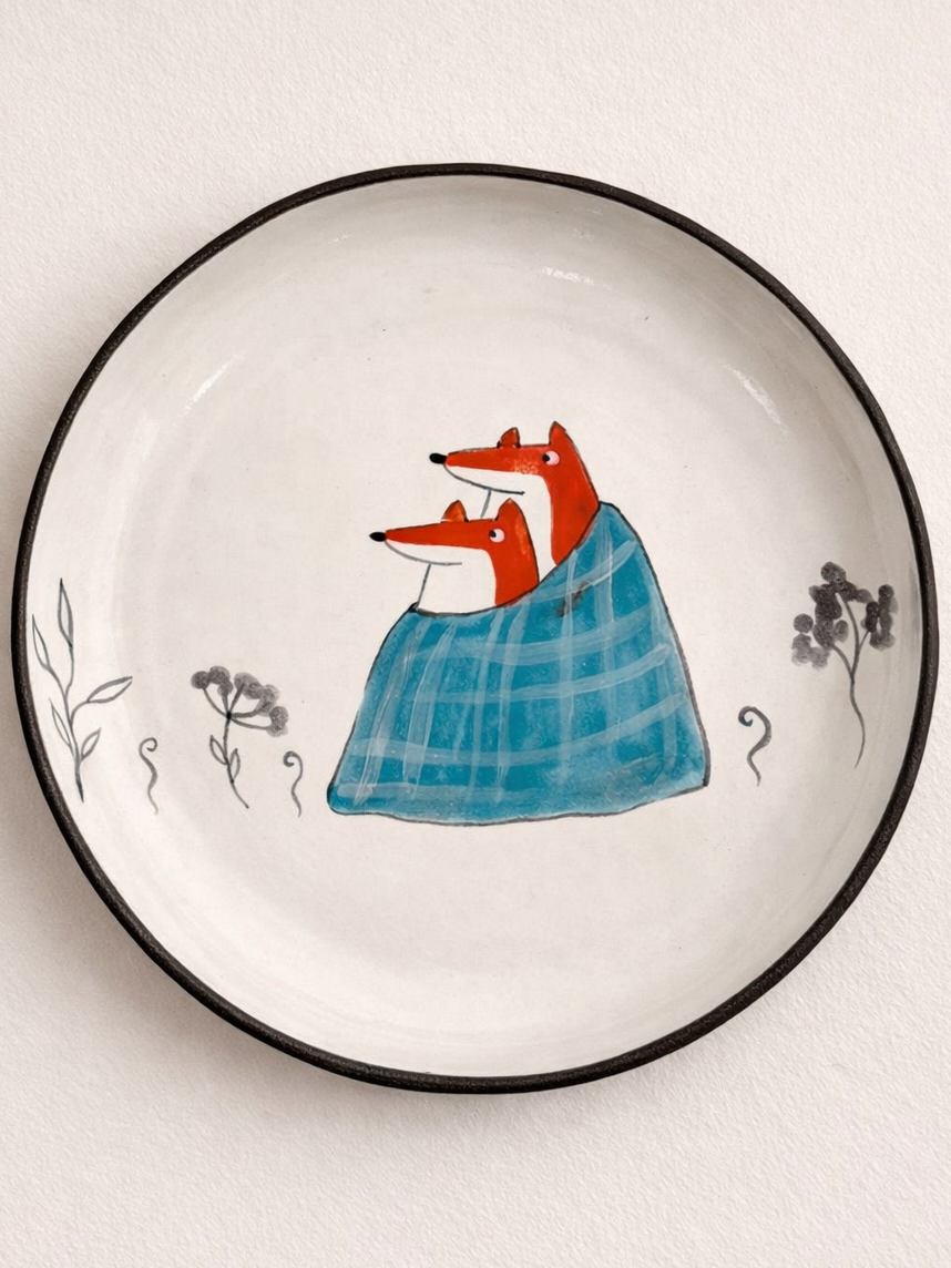 Керамическая тарелка ручной работы с бортиком «Пара лисичек с пледом». Производитель - керамистка Ситникова Юлия (Kim.ceramics).