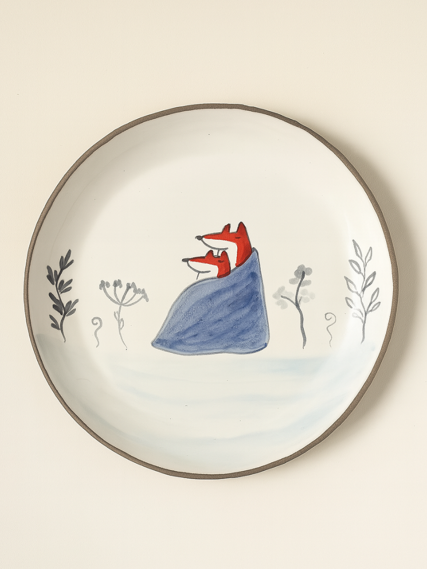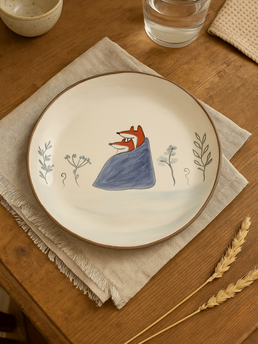Керамическая тарелка ручной работы с бортиком «Пара лисичек с пледом». Производитель - керамистка Ситникова Юлия (Kim.ceramics).